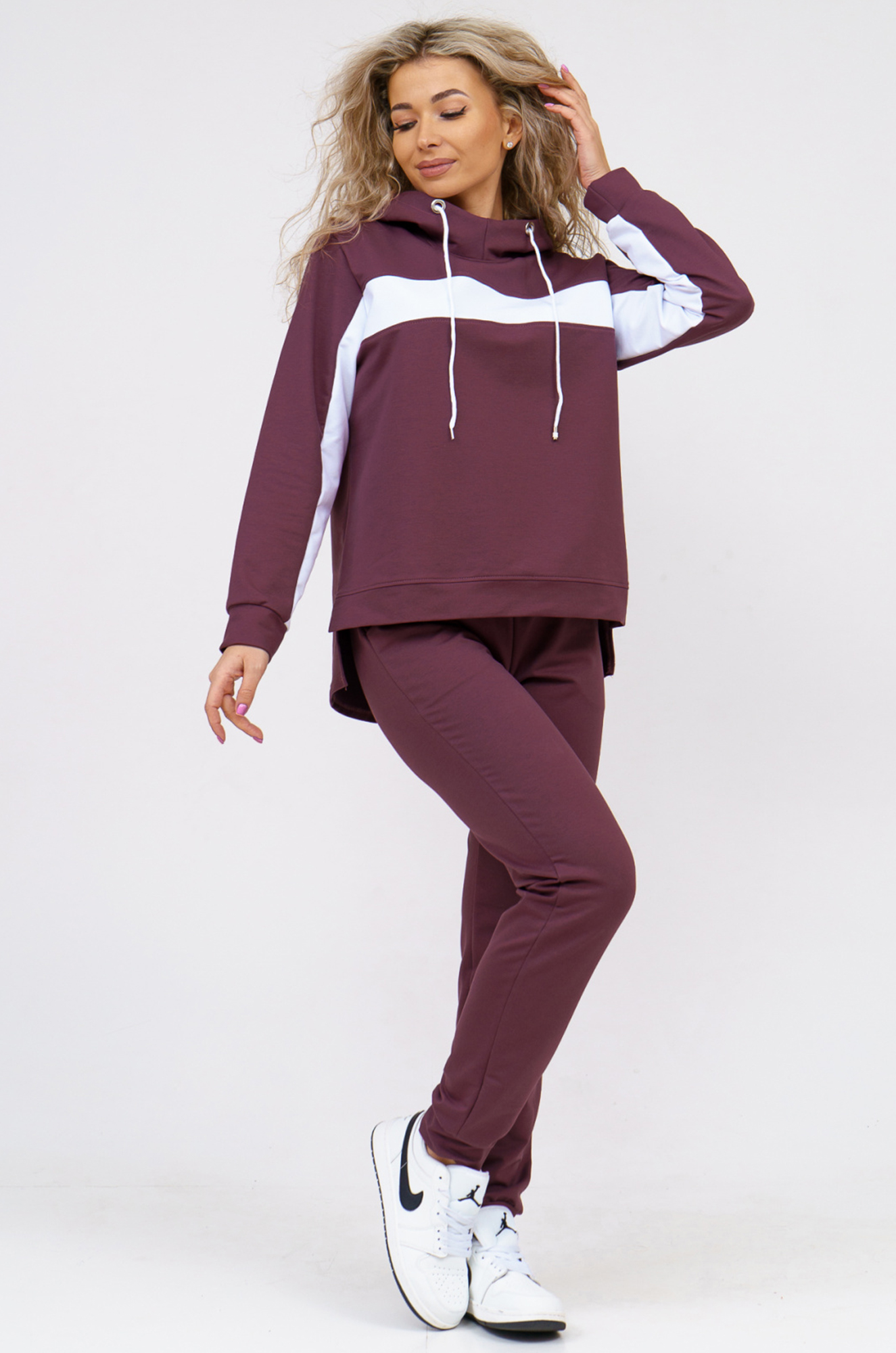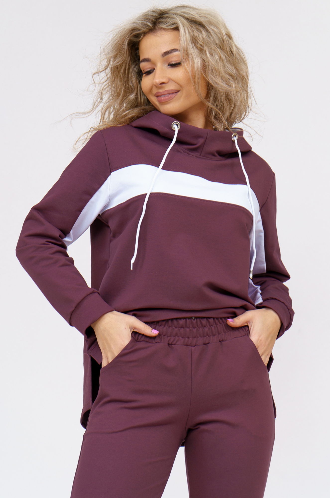 Удобный женский костюм спортивного кроя подойдёт и для дома и для прогулок в парке. Толстовка комбинированная, с контрастной горизонтальной вставкой и с капюшоном. Рукава и нижняя часть полочки на манжете, спинка удлинённая. Внизу по бокам небольшие разрезы. Брюки прямого кроя, с боковыми карманами, пояс на широкой резинке.