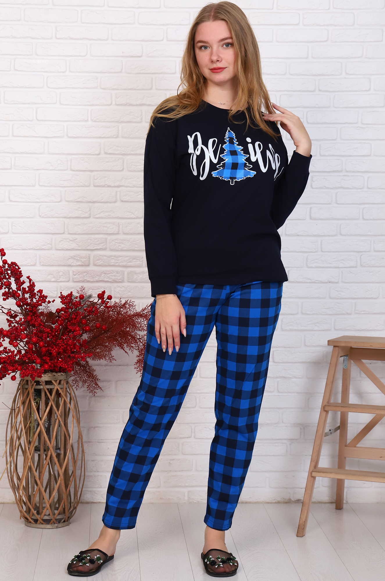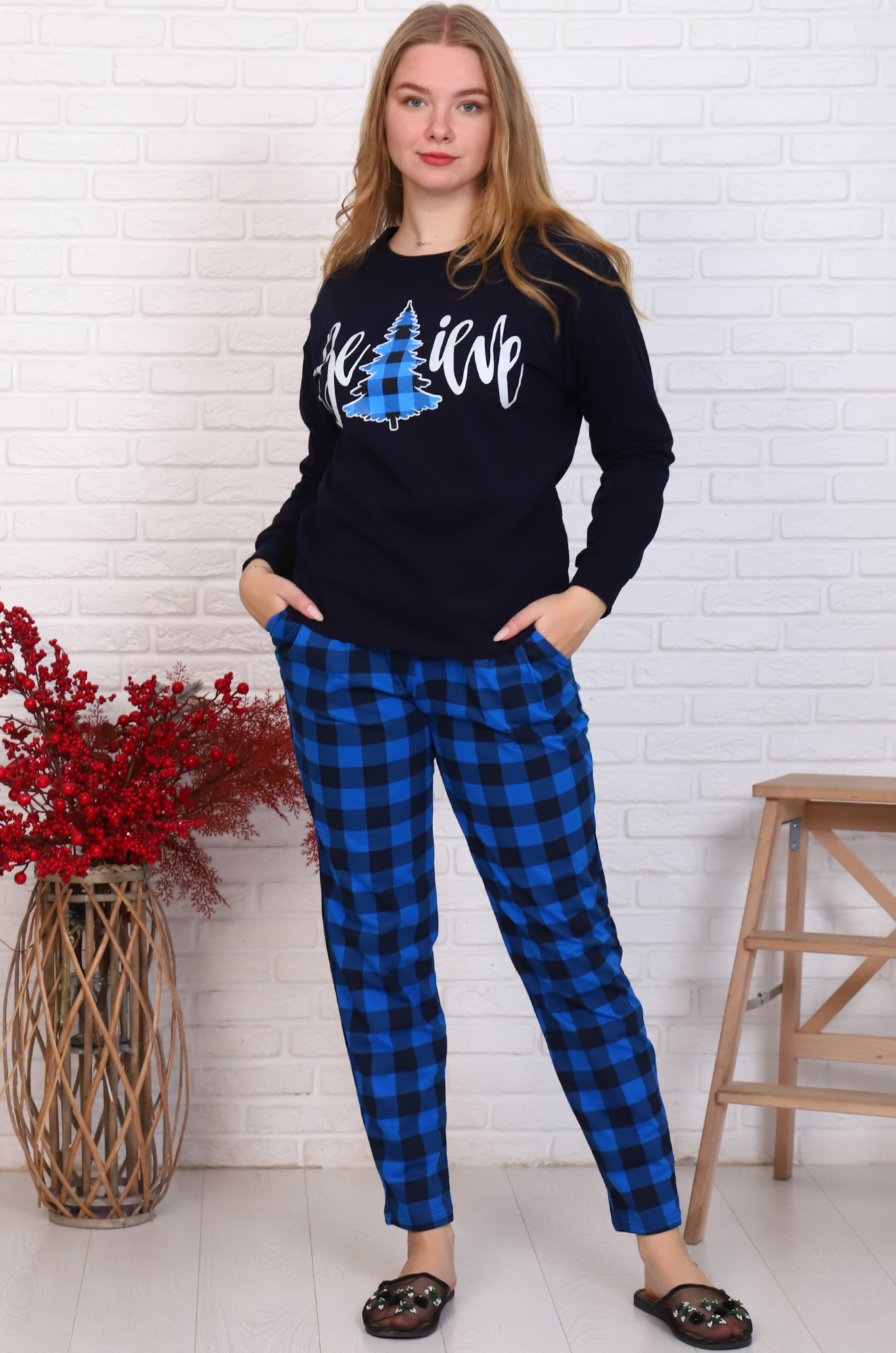 Симпатичный и удобный домашний костюм из качественного кулирного полотна. Футболка с длинным рукавом, на полочке "новогодняя" печать, рукава и горловина обработана рибаной. Брюки с боковыми карманами, зауженные к низу, пояс на резинке.