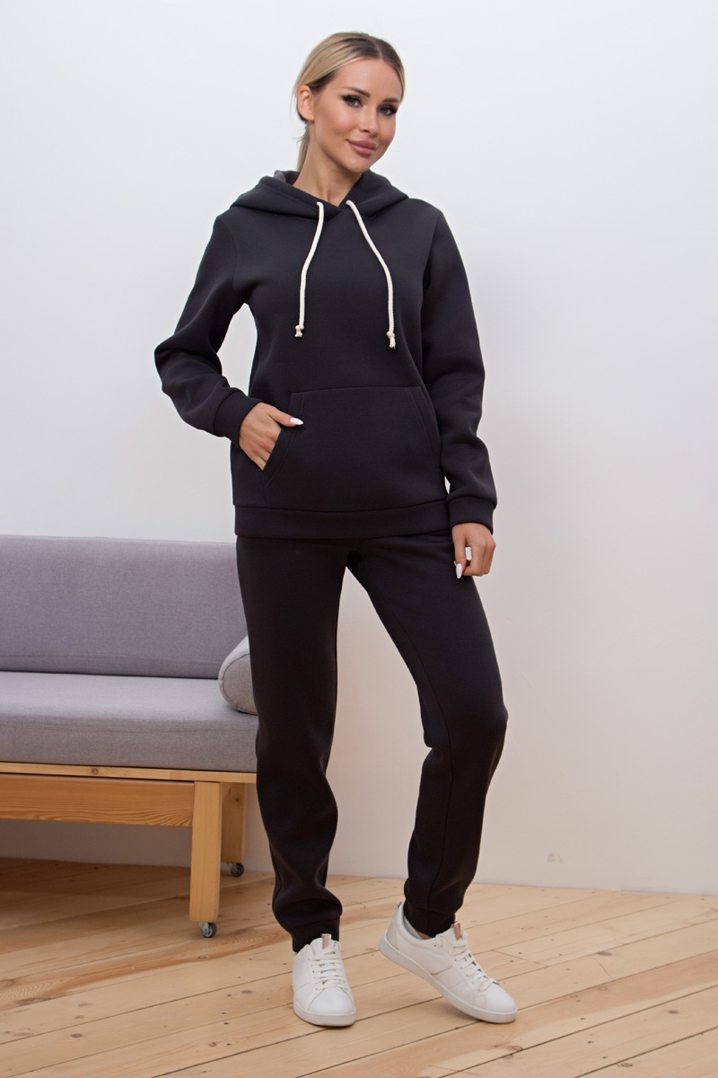 Стильный костюм из теплого трикотажного полотна - футер с начёсом. Состоит из худи и брюк. Худи с длинным втачным рукавом оканчивается притачной манжетой. Модель дополнена капюшоном с завязками. Низ оформлен манжетой, без разрезов. Спортивные штаны с эластичным поясом на резинке обеспечивают комфортную посадку. Брючины оканчиваются широкими манжетами. Модель имеет функциональные карманы в боковых швах.