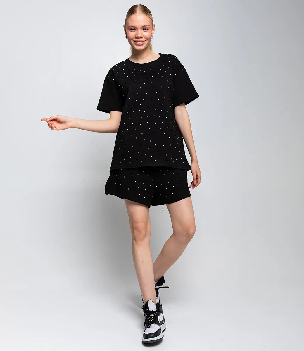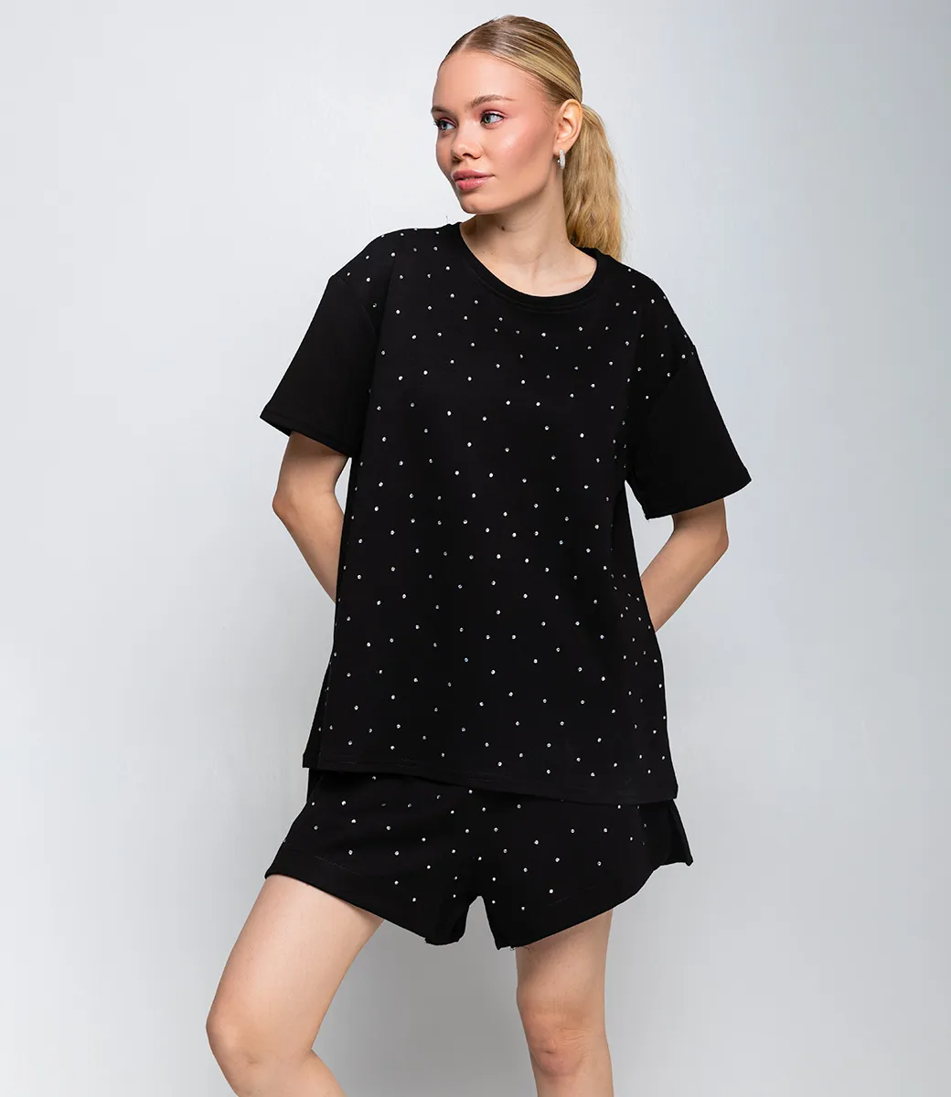 Костюм – это часть гардероба, которая подчеркивает стиль каждой женщины. Данная модель костюма для летнего сезона выполнена из ткани с содержанием 90% хлопка и 10% полиэстера, обеспечивая комфорт и удобство. Свободный костюм с шортами и футболкой дополнен яркими стразами, придающими изделию особое очарование. Даже после многих стирок костюм сохранит свою привлекательность. Обратите внимание на яркий и насыщенный цвет. Чтобы вы были уверены в размере, мы предоставили таблицу на странице. Воспользовавшись ею, вы сможете убедиться. Цена костюма является доступной. Подарите себе удовольствие быть стильной и неповторимой! Параметры модели: Рост 173, 84-58-89.