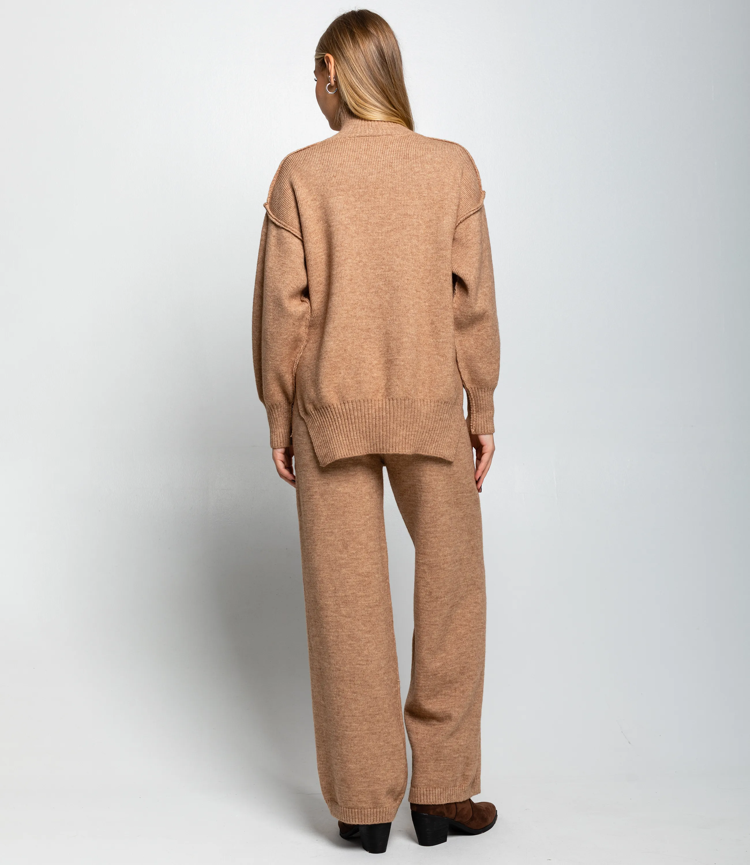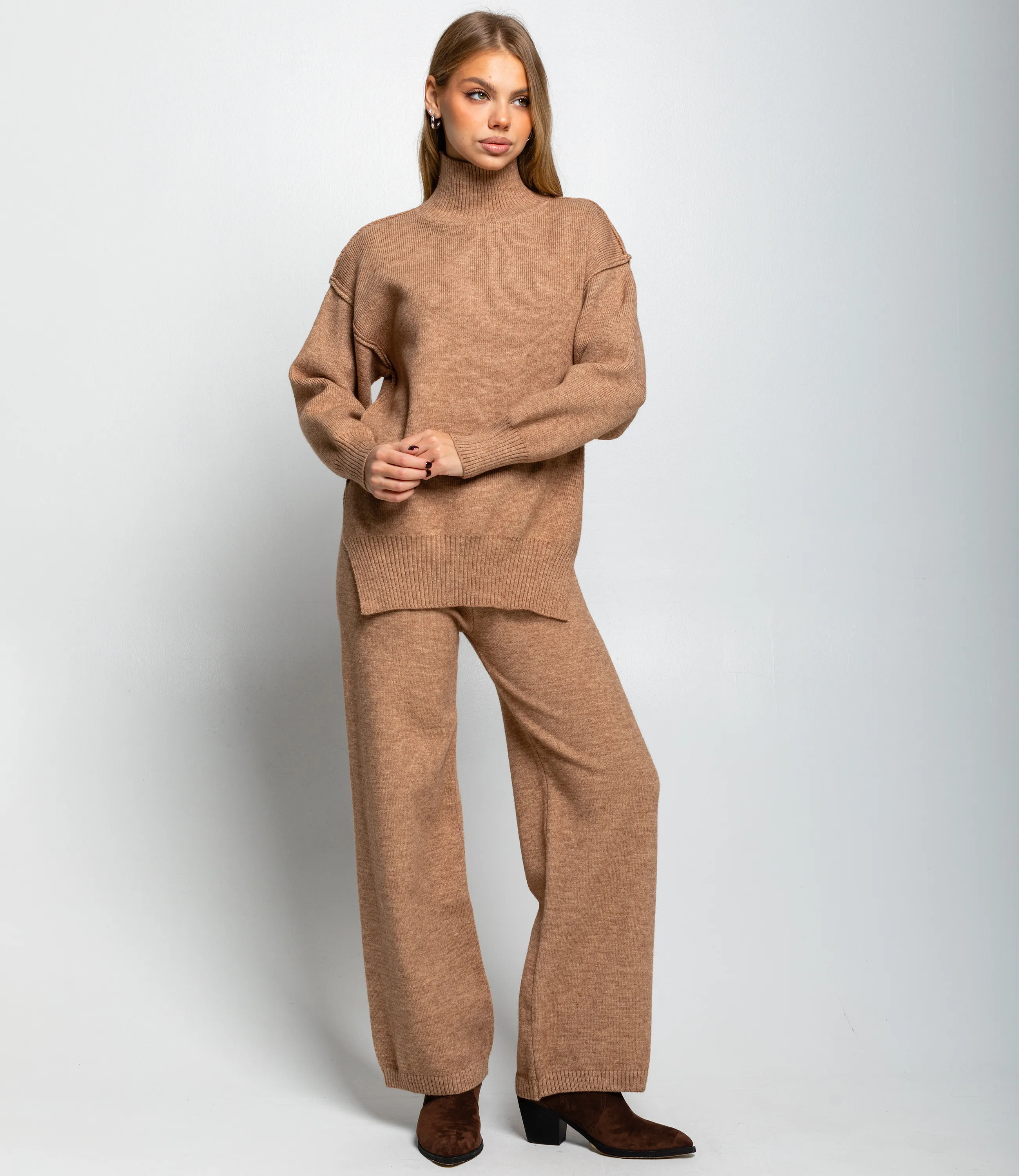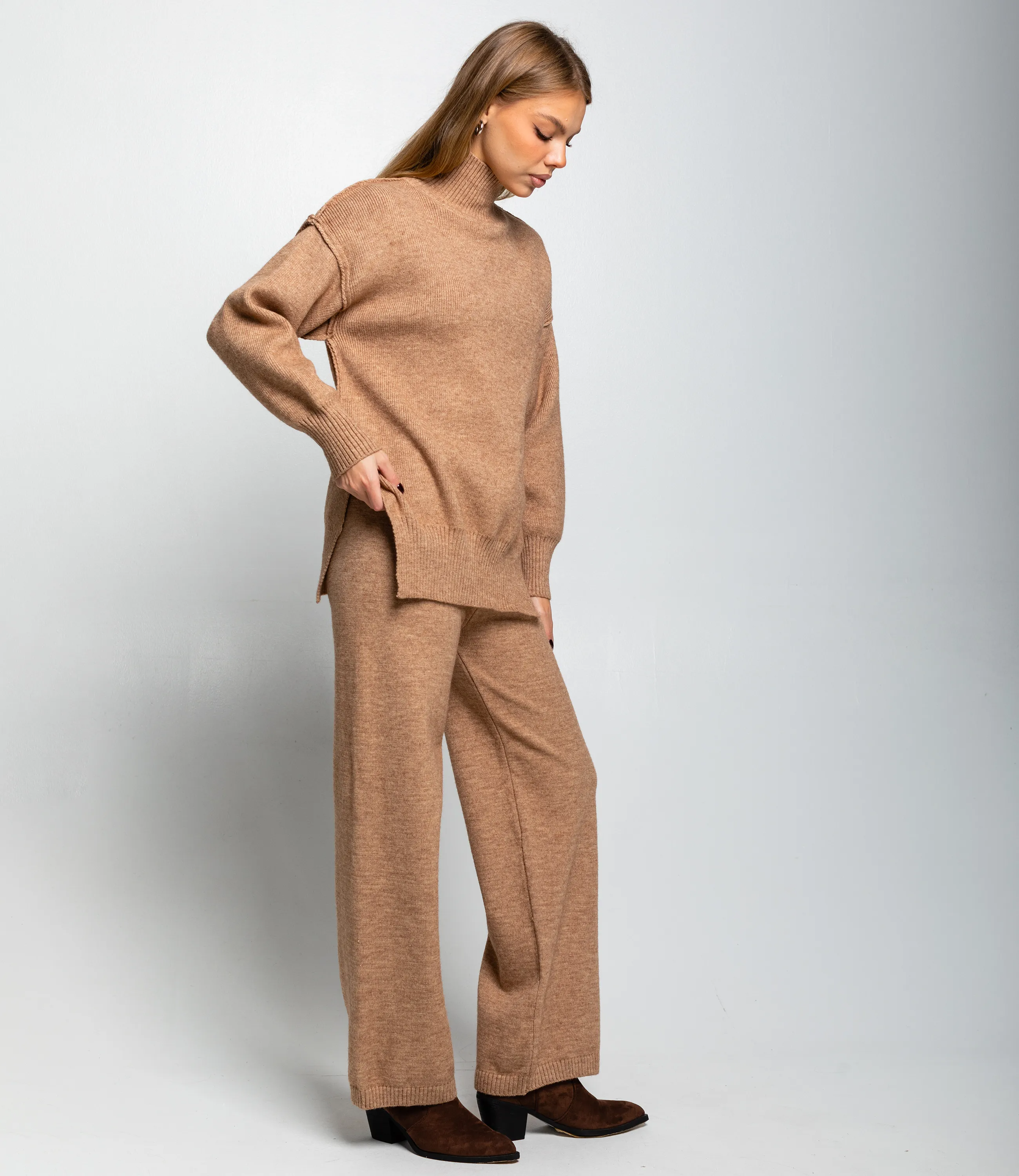 Костюм – это одежда, которая подчеркивает стиль и комфорт каждой женщины. Костюм составлен из просторного трикотажного свитера с высоким воротником‑стойкой и прямых свободных брюк из того же материала; свитер имеет слегка удлинённую линию корпуса, отрезной широкий ребристый нижний кант с разрезом по бокам и аккуратные декоративные швы по линии плеч, которые создают лёгкий объём рукава и подчёркивают relaxed‑силуэт, манжеты узкие, также выполнены резинкой для плотной посадки на запястьях. Ворот‑стойка средне‑высокая, плотно прилегающая, форма горловины обеспечивает дополнительное тепло и аккуратно сидит на шее без складок, плечи опущены для свободного силуэта, линия проймы мягко скроена, не ограничивает движений. Брюки прямого, слегка расклешённого книзу кроя с ровной линией бедра и свободным объёмом по ноге, талия со скрытой эластичной лентой для комфортной посадки, низ брюк отделан узкой резинкой, что придаёт лёгкую сборку у щиколотки. Для изготовления использованы ткани 52% акрил, 39% полиэстер и 9% шерсть, который характеризуются отличным качеством и дышащими свойствами. Даже после множества стирок изделие не утратит первоначальной красоты. Вы будете носить его с радостью. Обратите внимание на цвет. Он полностью соответствуют фотографии на сайте. Чтобы вы были уверены в размере, мы представили на странице таблицу. Воспользовавшись ею, вы сможете сами обмерить себя и удостовериться. Установленная нами цена является приемлемой. Не откажите себе в удовольствии быть стильной и комфортной! Рост 168, 89-63-90. Вы можете заказать онлайн презентацию на интересующие Вас модели. Наши менеджеры свяжутся с Вами и проведут индивидуальную видеотрансляцию, помогут составить заказ и ответят на Ваши вопросы.