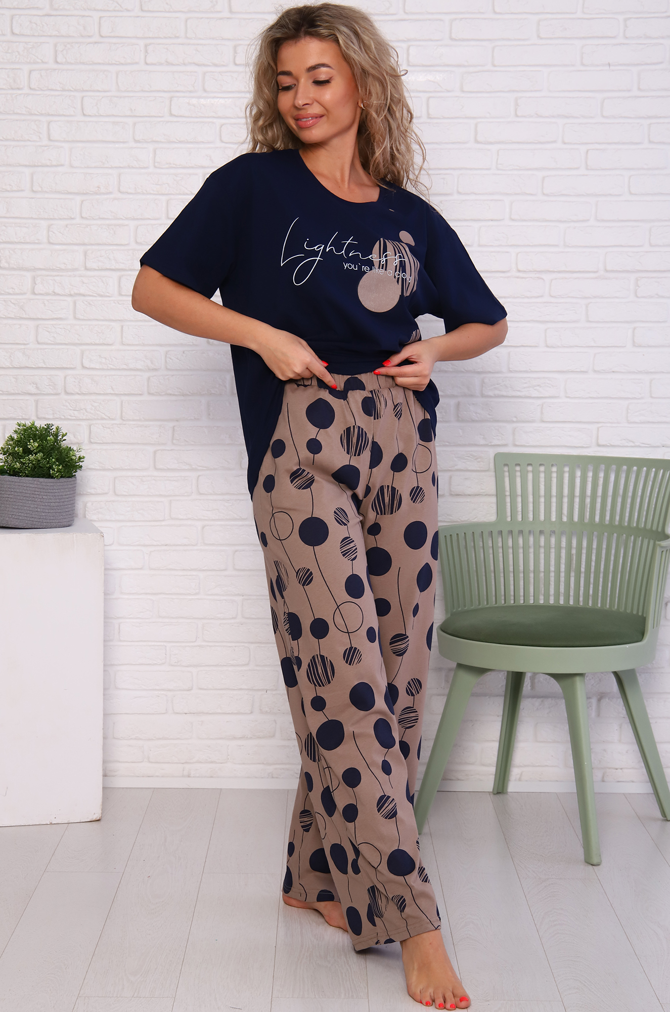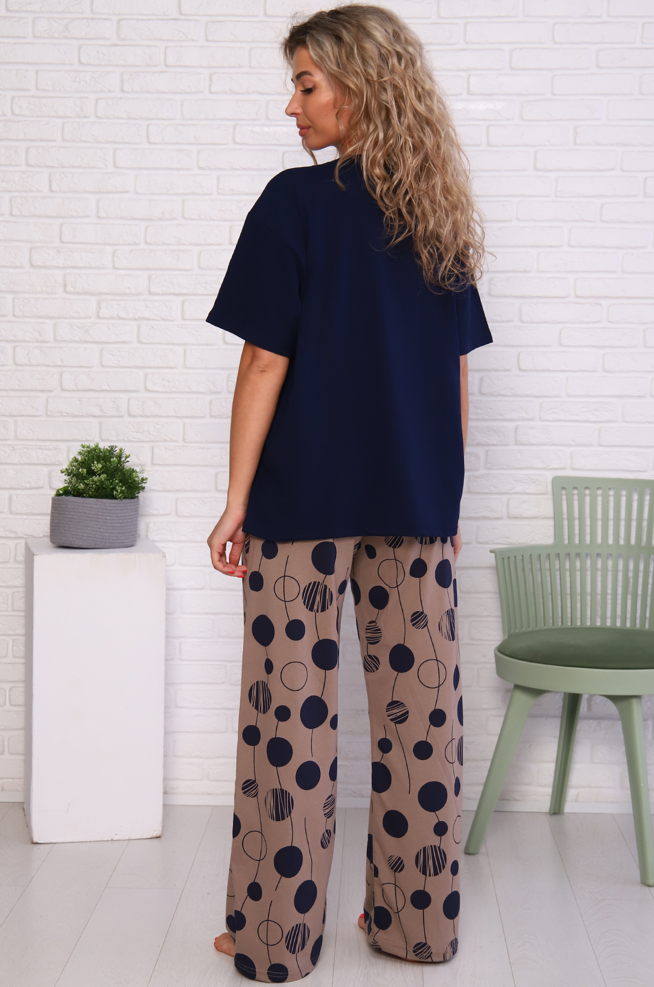 Удобный, стильный и невероятно женственный костюм для повседневного образа. Футболка однотонная модели "оверсайз" прямого, свободного кроя. Рукав со спущенным плечевым швом, на полочке фантазийный принт, повторящийся с ткани брюк. Брюки-кюлоты свободного кроя, не стесняют движения, с боковыми карманами, пояс на широкой резинке. Прекрасный вариант для дома и дачи, на отдых или прогулку.