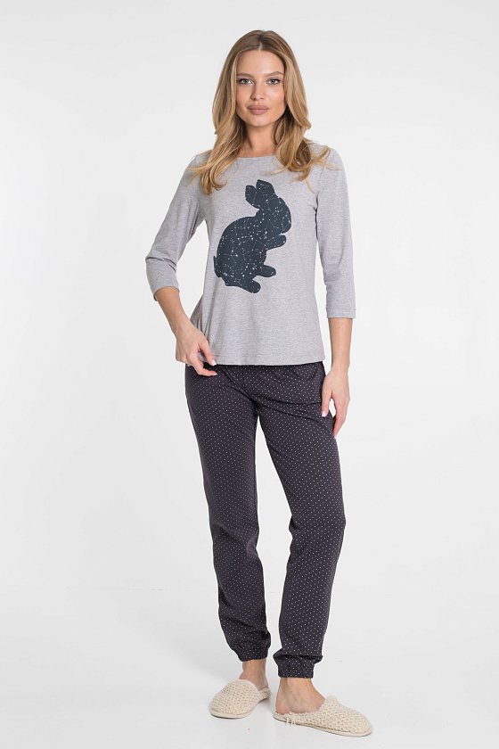 Футболка однотонная, с круглым вырезом горловины, спереди расположен принт. Втачной рукав длиной 3/4.