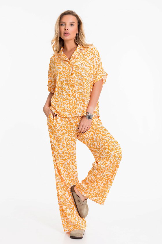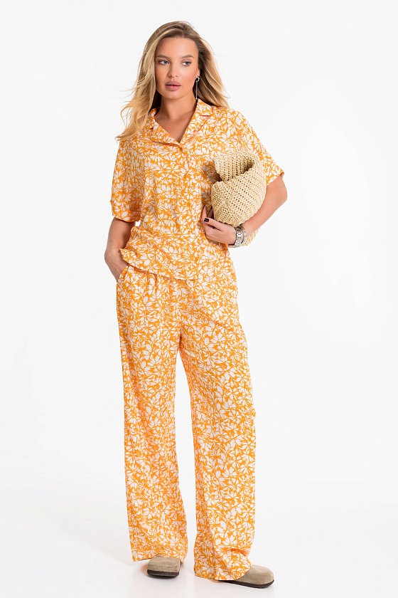 Костюм выполнен из лёгкого и приятного к телу штапельного полотна с набивным рисунком. В комплект входят рубашка и брюки. Рубашка свободного фасона (оверсайз), с цельнокроеными рукавами длиной чуть выше локтя и аккуратными отложными манжетами. На спинке — застроченная бантовая складка, обеспечивающая дополнительную свободу движений. Застёжка на пуговицы, отложной воротник и накладной карман на груди завершают образ. Брюки прямого свободного кроя с комфортным притачным поясом и регулирующим шнуром. По бокам — удобные карманы. Этот комплект — универсальный выбор для прогулок, работы и отдыха. Лёгкость ткани и продуманный крой обеспечат максимальный комфорт в течение всего дня.