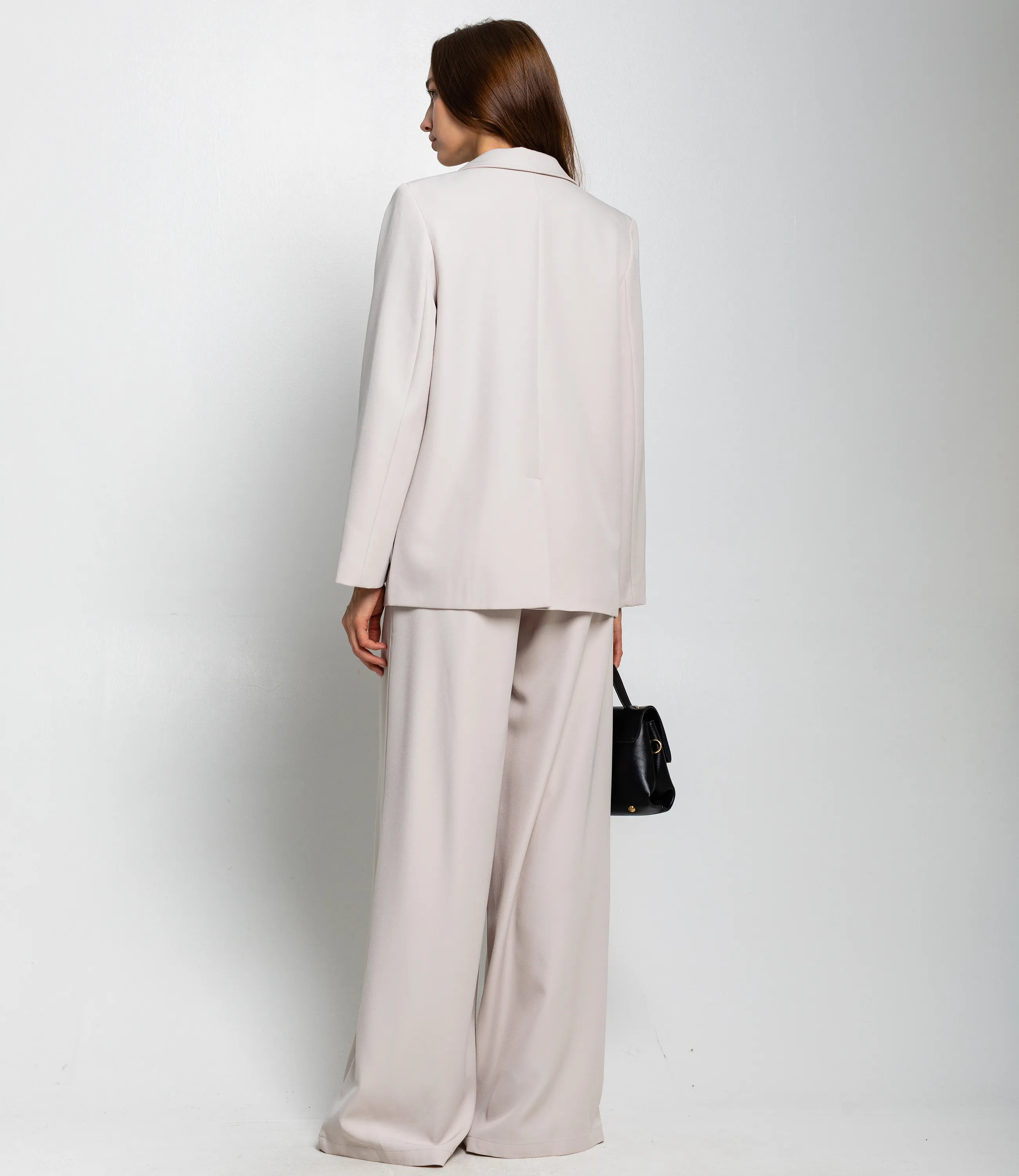 Костюм – это одежда, которая подчеркивает стиль и комфорт каждой женщины. Двубортный жакет прямого кроя с лёгкой структурой плеч и свободным объёмом по торсу. Длина жакета до середины бёдер. Брюки с высокой посадкой и очень широкими штанинами, свободно ниспадающие от бёдер до пола, с выраженной центральной стрелкой. Костюм оформлен в минималистичном, строгом стиле, подходит для деловых и элегантных повседневных образов. Хорошо сочетается с тонкими трикотажными или шелковыми топами, обувью на каблуке или лаконичными лоферами, а также с небольшими структурированными сумками. Для изготовления использованы ткани 100% полиэстера, который характеризуются отличным качеством и дышащими свойствами. Даже после множества стирок изделие не утратит первоначальной красоты. Вы будете носить его с радостью. Обратите внимание на цвет. Он полностью соответствуют фотографии на сайте. Чтобы вы были уверены в размере, мы представили на странице таблицу. Воспользовавшись ею, вы сможете сами обмерить себя и удостовериться. Установленная нами цена является приемлемой. Не откажите себе в удовольствии быть стильной и комфортной!