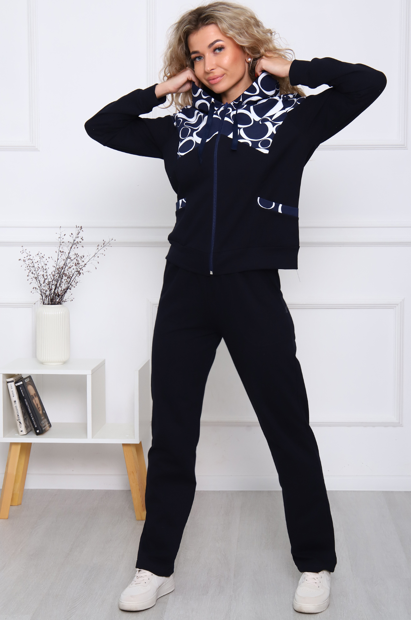 Удобный женский костюм спортивного кроя подойдёт и для дома и для прогулок в парке. Толстовка с комбинированной кокеткой, на молнии, с двойным капюшоном и накладными карманами, снизу на манжете. Брюки прямого кроя, с боковыми карманами, пояс на широкой резинке.
