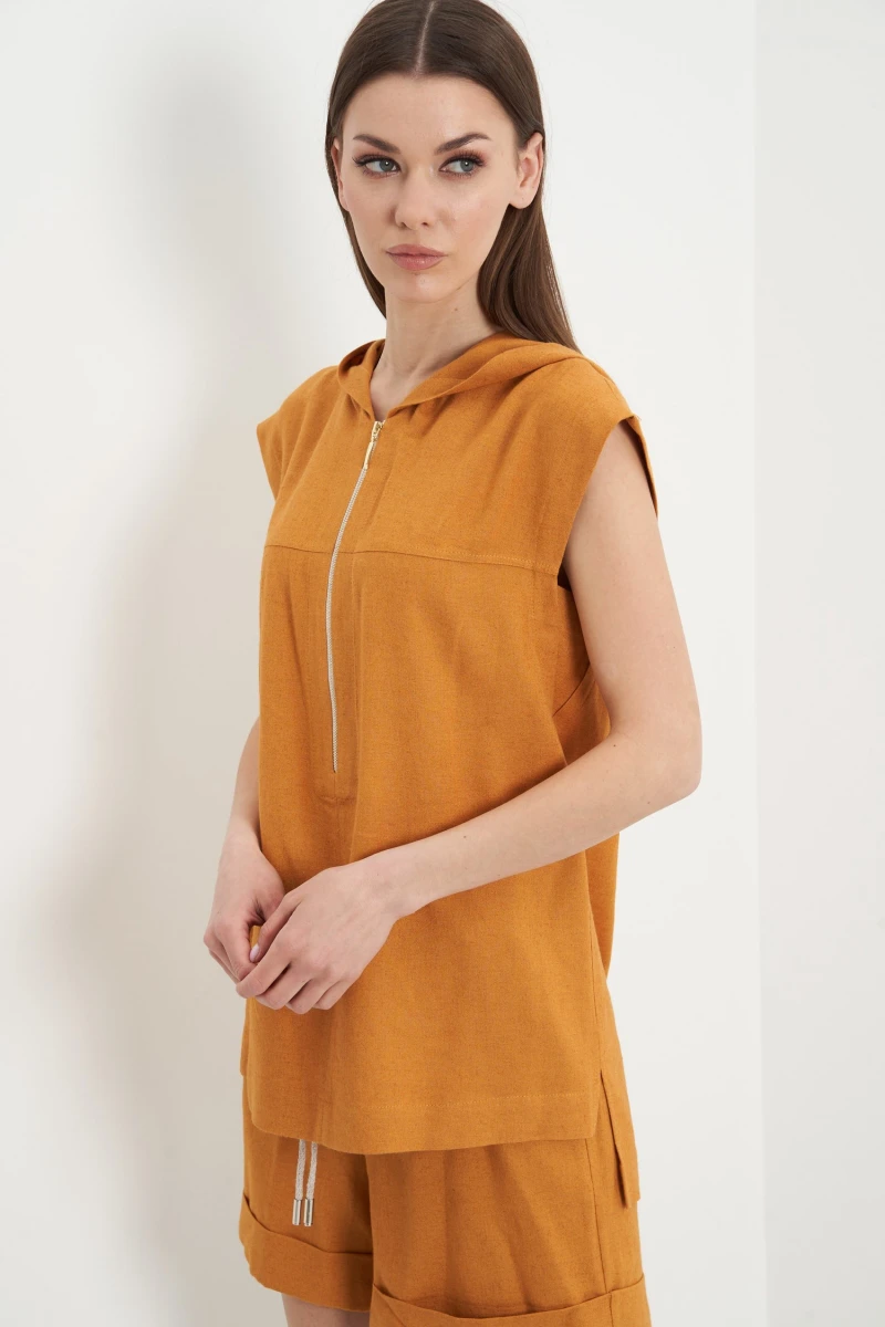 Практичный и удобный льняной комплект - лучший вариант для летней жары и тёплого солнца. Комплект двухпредметный состоит из удлинённой туники без рукавов и шорт на резинке. Туника прямого силуэта со спущенной линией плеча и проймой, переходящей в подрез треугольной формы. Перед лифа состоит из двух частей: горизонтальной кокетки с цельнокроенным капюшоном и нижней частью. Застёжка на тесьму-молнию в центральном шве переда. Спинка состоит из двух частей: горизонтальной кокетки и нижней части. Спинка чуть длиннее переда и разрезами по боковым швам. В качестве отделки-декоративная нашивка на спинке. Шорты свободной формы на притачном поясе с эластичной тесьмой. Пояс с декоративным шнуром и двумя люверсами, позволяющий фиксировать шорты на любой талии. Карманы наклонные, в боковых швах. Низ шорт с  отложной манжетой. Длина туники по среднему шву спинки около 74 см. Длина штор по боку около 40 см.