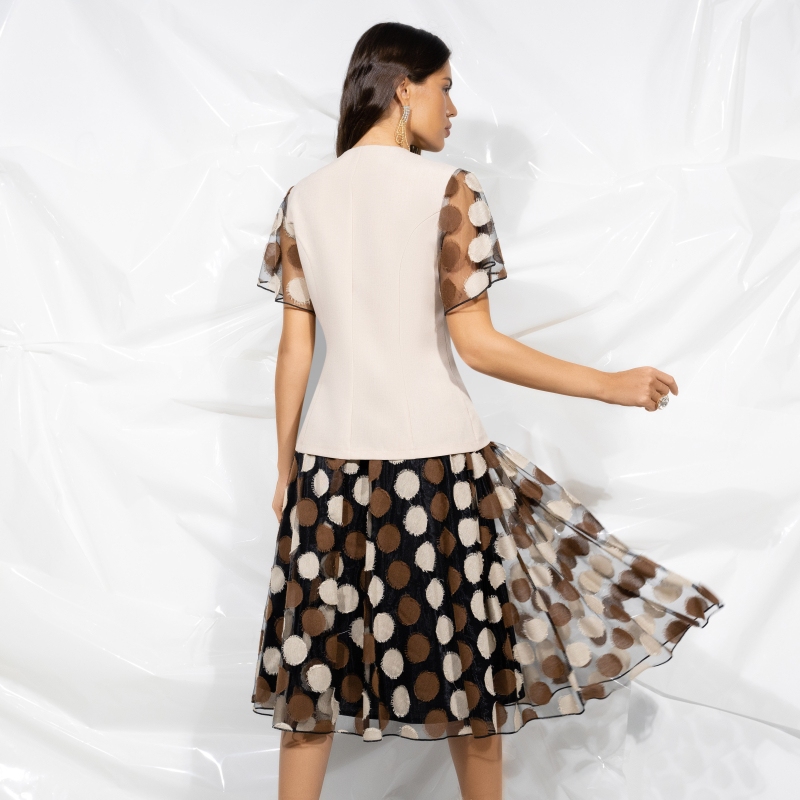 Для приготовления божественного тирамису возьмите кружку крепко заваренного американо, печенье «Савоярди» и отправляйтесь наслаждаться кофе-брейком в костюме CHARUTTI в цветах итальянского десерта. Комплект состоит из расклешенной юбки в длине миди и жакета приталенного силуэта. Жакет имеет асимметричную застежку на акцентные пуговицы с драпировкой. Пояс юбки на широкой резинке. Ткань верхнего слоя юбки и рукавов жакета текстурная.