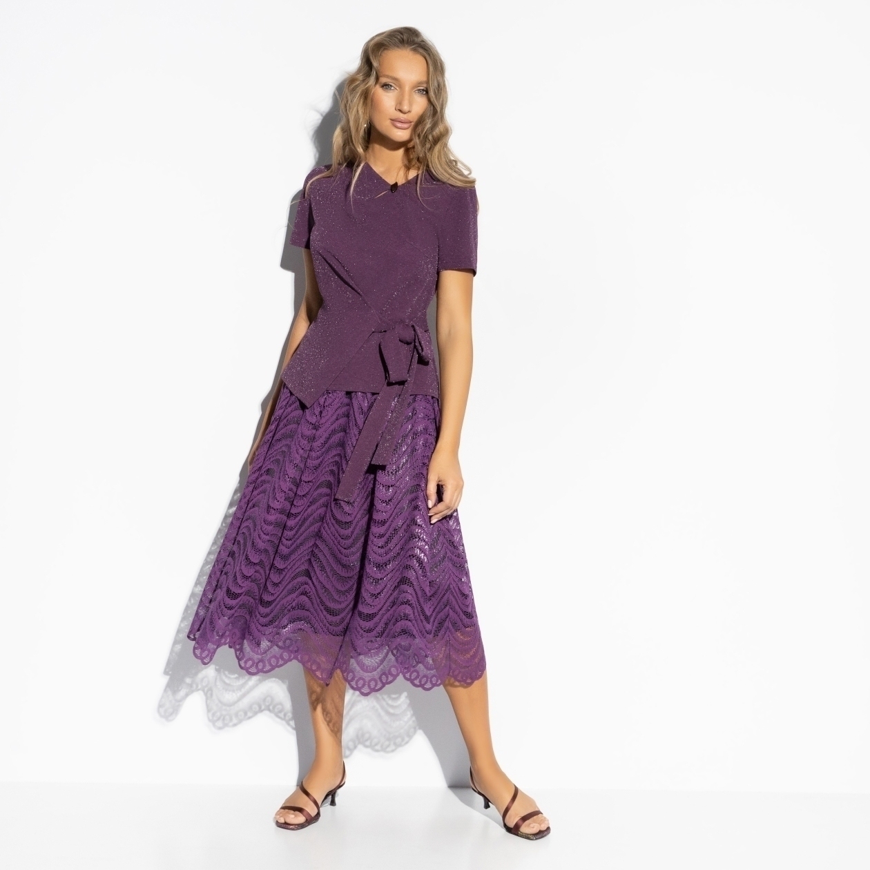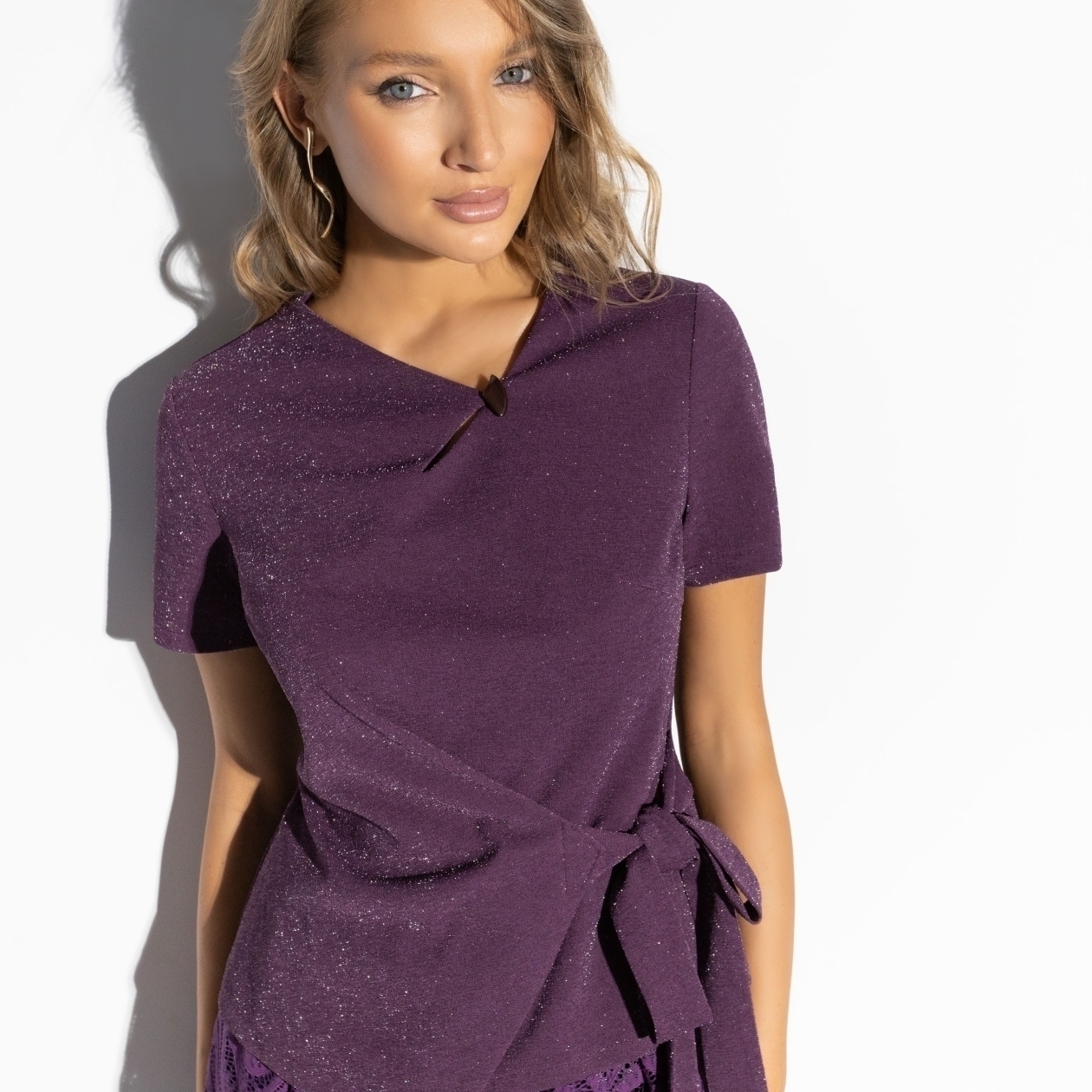 Так красиво, перестаю дышать... Этот аметистовый оттенок делает образ особенным – загадочным, магическим, совершенно неземным. Мерцающее сияние ткани создаёт вокруг ореол тайны заставляя поверить: рядом происходит настоящая магия. Топ с драпировкой и бантом, юбка на резинке с изящным узором. Для волшебных встреч и незабываемых моментов!