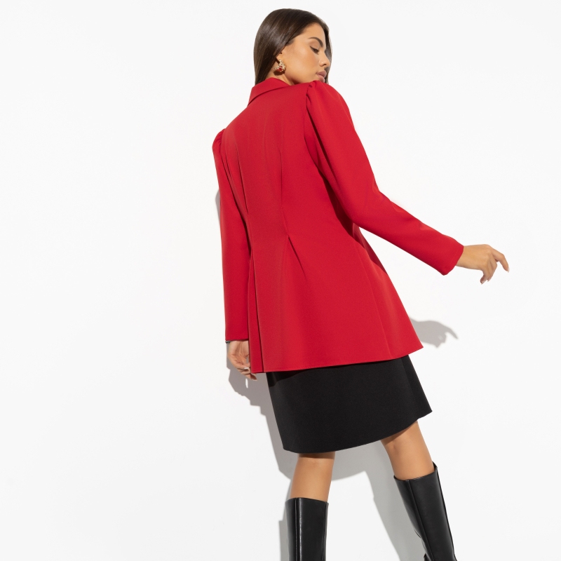 Детский праздник перестанет быть скучным для всех взрослых, если вы придете в таком комплекте. Ребенок будет гордиться мамой, которая взяла часть праздничной программы на себя и стала украшением этой вечеринки. Костюм из удлиненного двубортного жакета с лацканами и юбки на резинке. Рукав со сборкой на линии плеча. Есть подклад. Приталенный силуэт.