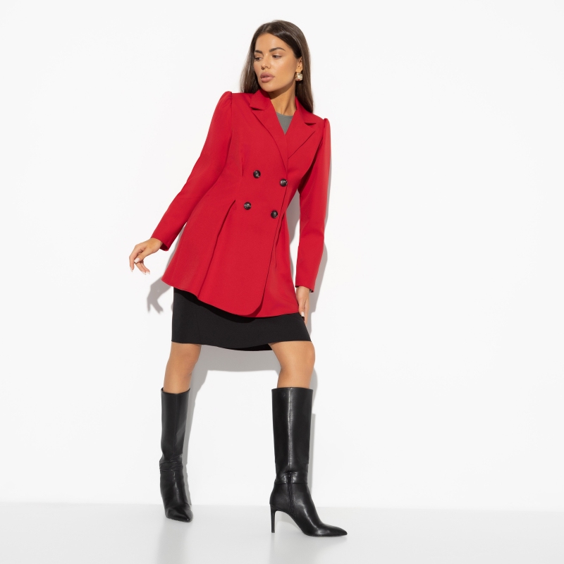 Детский праздник перестанет быть скучным для всех взрослых, если вы придете в таком комплекте. Ребенок будет гордиться мамой, которая взяла часть праздничной программы на себя и стала украшением этой вечеринки. Костюм из удлиненного двубортного жакета с лацканами и юбки на резинке. Рукав со сборкой на линии плеча. Есть подклад. Приталенный силуэт.