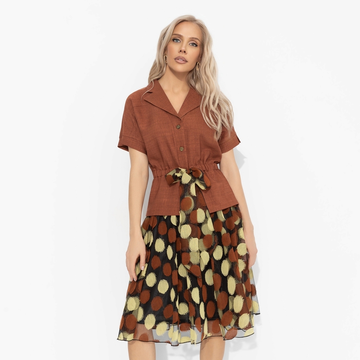 Лёгкое движение – и юбка оживает, словно танцует под музыку ветра. Этот костюм – для тех, кто ценит игру форм и фактур, кто умеет сочетать элегантность с лёгкой ироничностью. «Светские манеры» – не про строгость, а про очарование уверенности и чувство собственного стиля. Костюм с юбкой из сетки в крупный горох. Контраст текстур, струящаяся форма и акцент на поясе создают идеальный баланс между шиком и комфортом.