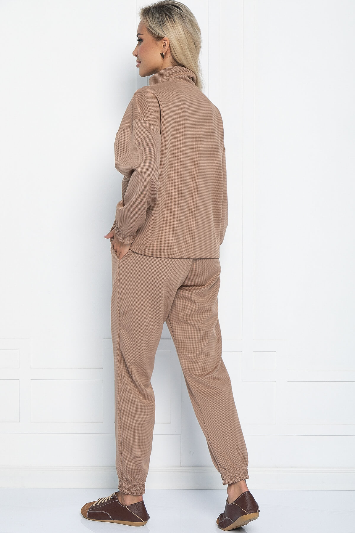 Повседневный костюм в стиле спорт-шик. Воротник-стойка, удобный спущенный рукав на резинке. Молния расстёгивается до груди, поэтому вы можете регулировать степень открытости груди. Брюки на эластичной манжете, чтобы можно было регулировать их длину. Есть брючные карманы.