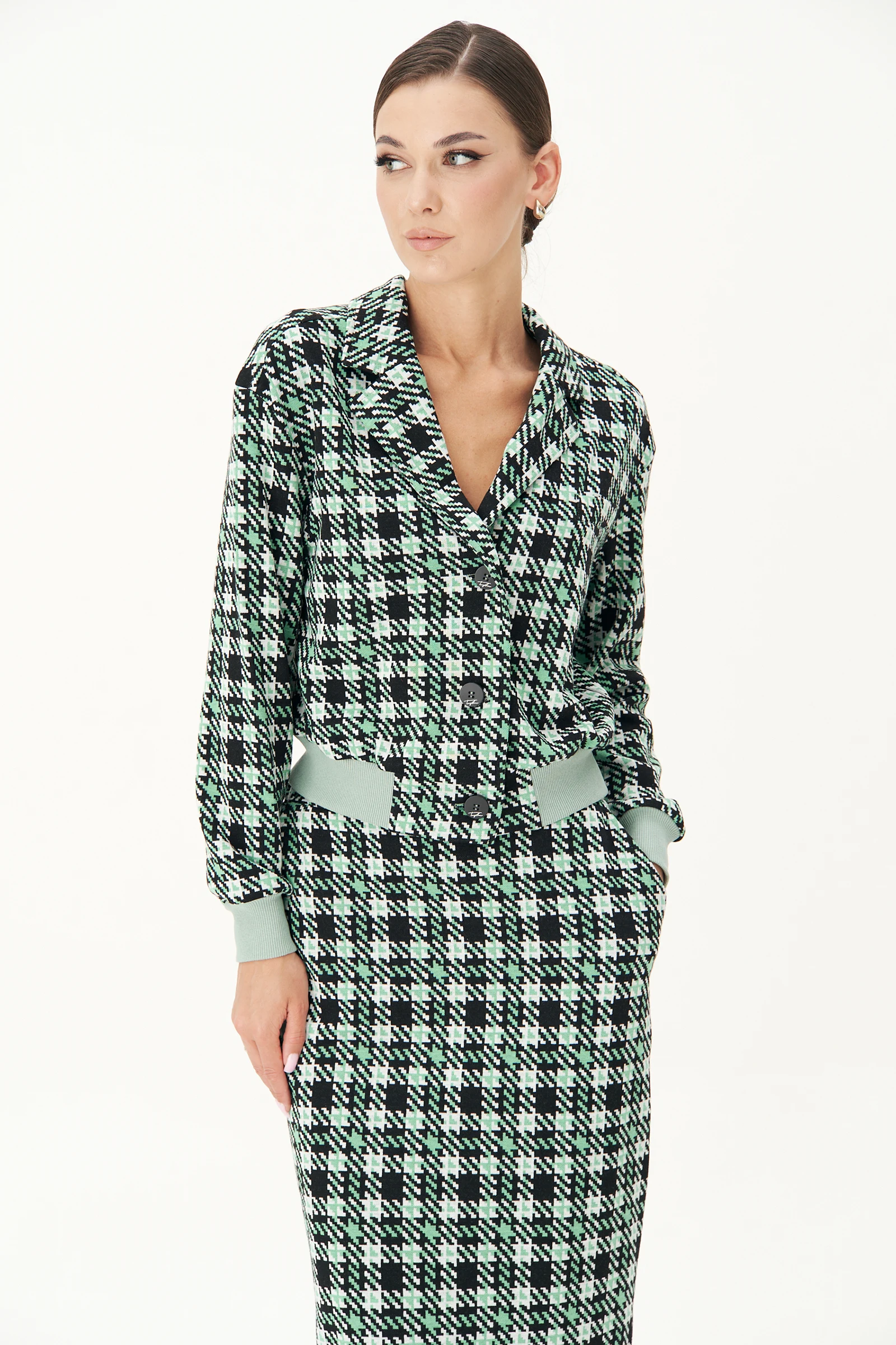 Холодный осенний сезон вовсе не повод отказываться от красивых костюмов, тем более, что среди трендовых моделей есть очень комфортные, уютные и тёплые. Жаккардовое смесовое трикотажное полотно в стилизованную гусиную лапку в модном цветовом решении. Жакет без подкладки, свободного силуэта со слегка заниженной линии плеча. Застёжка центральная на петли и пуговицы, воротник - классический английский. По низу рукавов и жакета - контрастный довяз. Юбка прямая, на притачном поясе, с боковыми наклонными карманами на передней половинке и отрезной кокеткой, средним швом и накладными карманами на задней. Застёжка в среднем шве спинки, пояс с эластичными вставками. Длина жакета около 52 см. Длина рукава около 60 см. Длина юбки около 68 см.