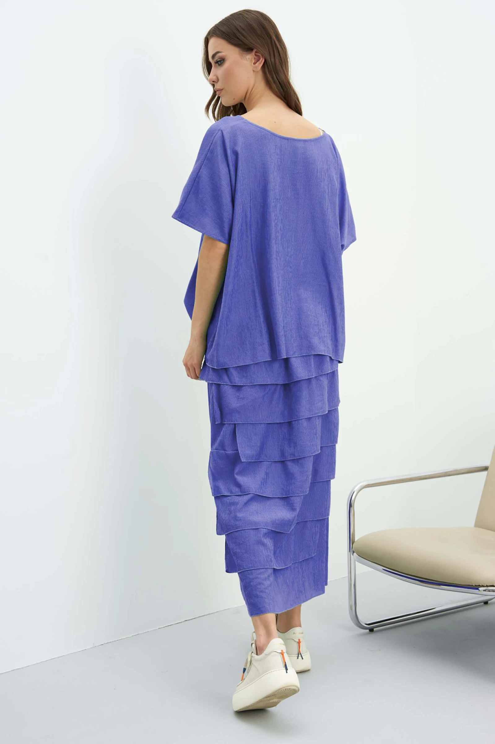 Казалось бы, лучшая одежда для тёплого лета - это платье, сшитое из лёгкой ткани, однако, по сравнению с платьем или сарафаном, комплект имеет преимущества, которые сложно оспорить. Во-первых, хорошая комбинаторность. Вы легко можете сочетать вещи комплекта с другими предметами гардероба - футболками, брюками, топами. Во-вторых, комплект умело скрывает недостатки телосложения, при этом подчёркивает женственность, являясь более практичной одеждой. Комплект состоит из свободной бузы и юбки. Блуза с расширенной линией горловины цельнокроенного покроя с коротким рукавом, широкая по форме с прямой линией низа. Юбка на широком притачном поясе с удобной эластичной лентой внутри и застёжкой на потайную тесьму - молнию сбоку. И поскольку многослойность сейчас в тренде - переднее с заднее полотнище юбки выполнено в виде настрочных асимметричных воланов без сборки - что даёт нужный правильный эффект без оптического увеличения объёмов. Комплект дополнен широким мягким поясом, который по Вашему желанию подчеркнёт линию талии. Длина блузы по спинке около 56 см, длина юбки около 89 см.