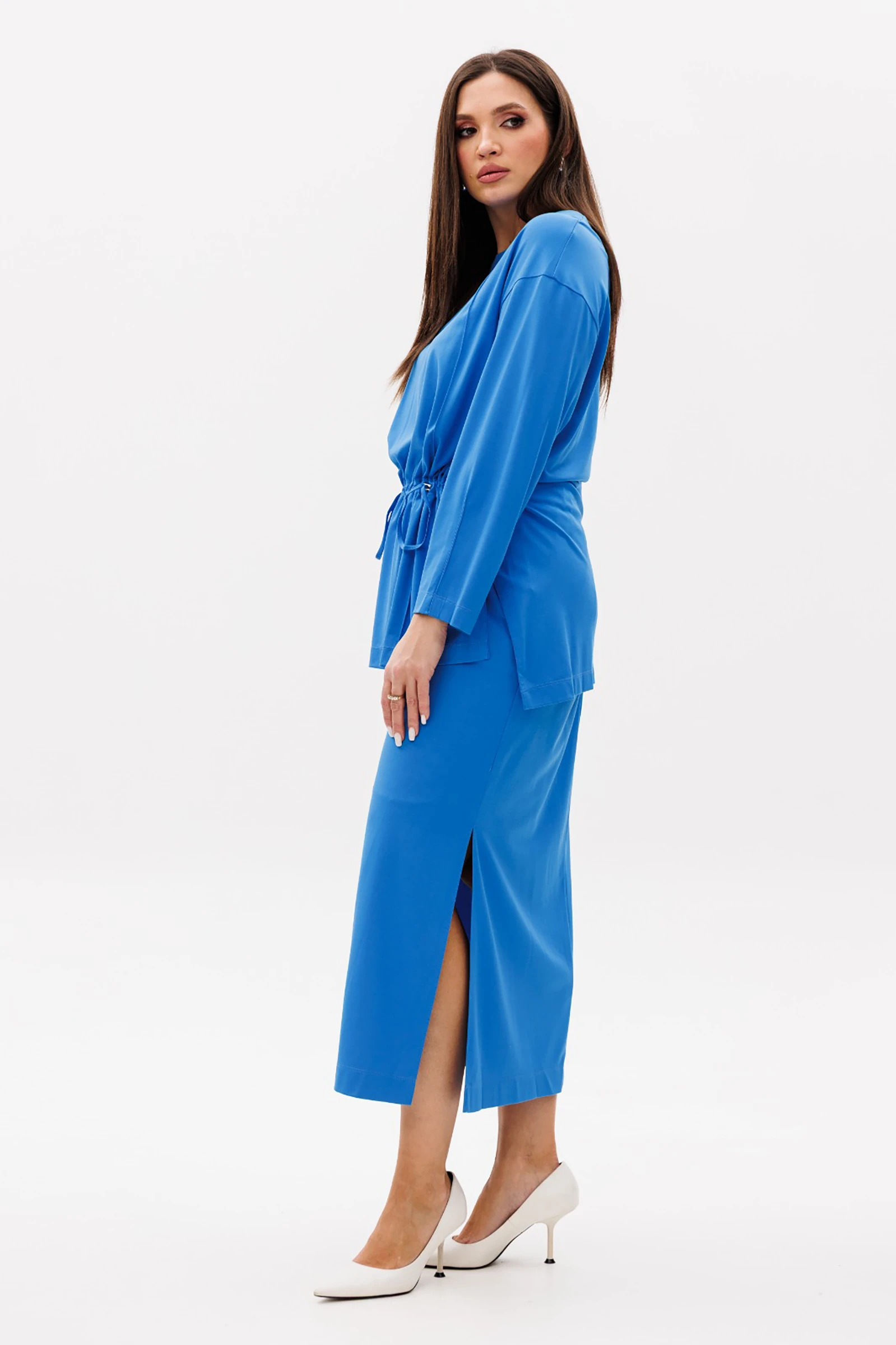 Трикотажный костюм с юбкой в текущем сезоне занимает лидирующие позиции как на модных подиумах, так и в наших модных гардеробах. Смотрится он в разы интереснее, чем брючный, не говоря уже о его женственности.Блуза свободного упрямлённого силуэта с заниженной линией плеча, круглым вырезом, рукавом, расширенным в области оката. Полочка с вертикальными рельефами-защипами от горловины и кулисой с регулирующими фиксаторами и шнуром. Спинка со средним швом, молнией и вытачками-защипами от линии горловины. Рукав с вытачкой-защипом от линии низа. Низ изделия разноуровневый.Юбка прямая, макси, с центральным защипом по переднему полотнищу, боковыми наклонными карманами, разрезом по боковому шву и эластичным поясом.Длина блузы около 78 см. Длина рукава с плечом около 72 см. Длина юбки около 90 см.