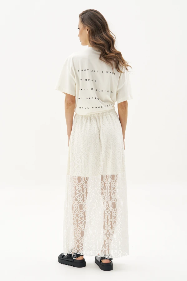 Мода лета 2024 представляет прозрачные ткани, как один из ключевых трендов сезона.Платья из таких полотен уже давно не в новинку, но в этом сезоне к ним мы добавили другую вариацию женской одежды : невероятный юбочный комплект, который создаёт у окружающих иллюзию подглядывания.Свободная футболка и гипюровая длинная юбка с эластичной короткой юбкой внутри.Футболка широкая, удлинённая, с дизайнерским принтом и заниженной линией плеча.Юбка макси, в расслабленном стиле, на притачном эластичном поясе и с подкладкой юбкой из хб трикотажного полотна.