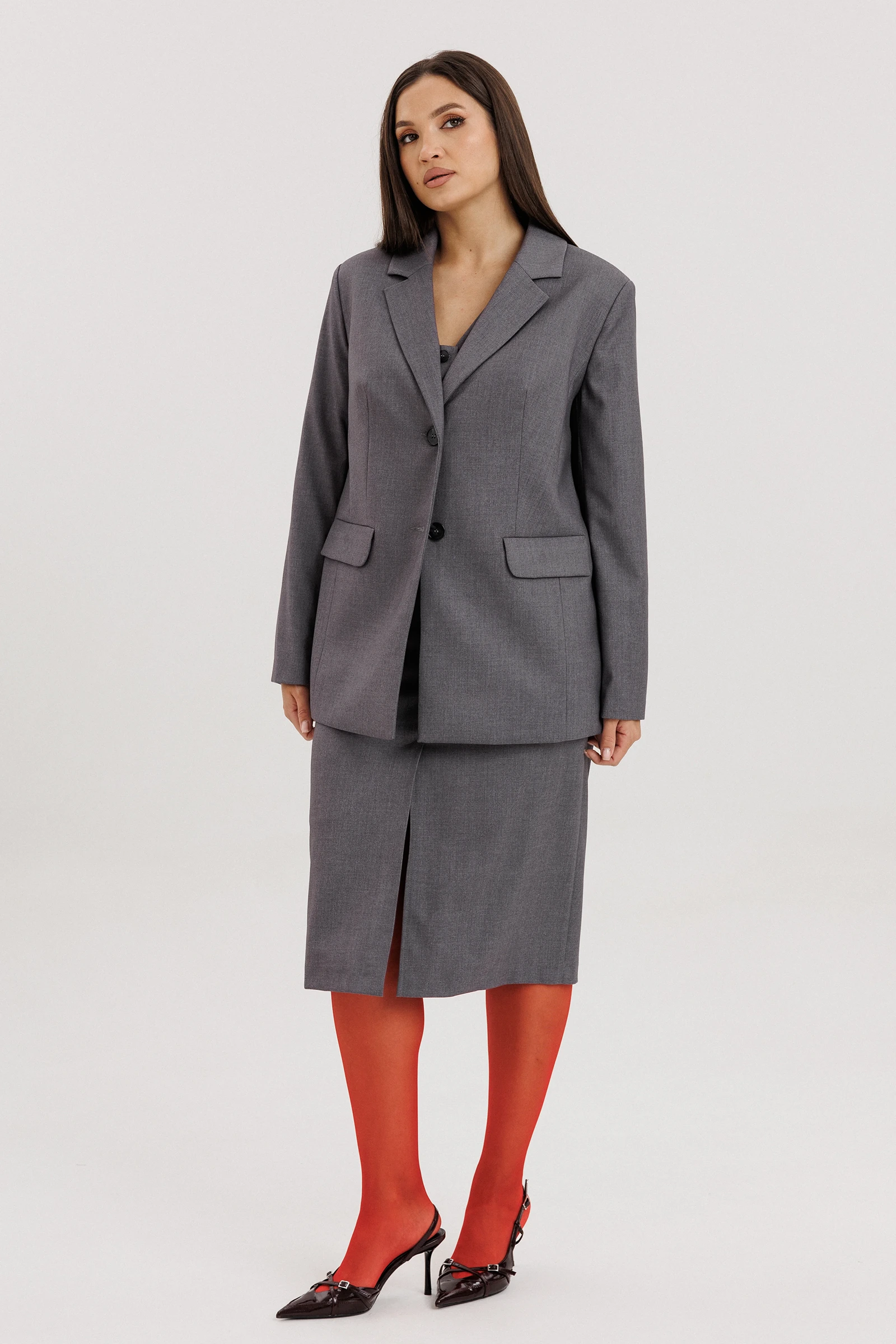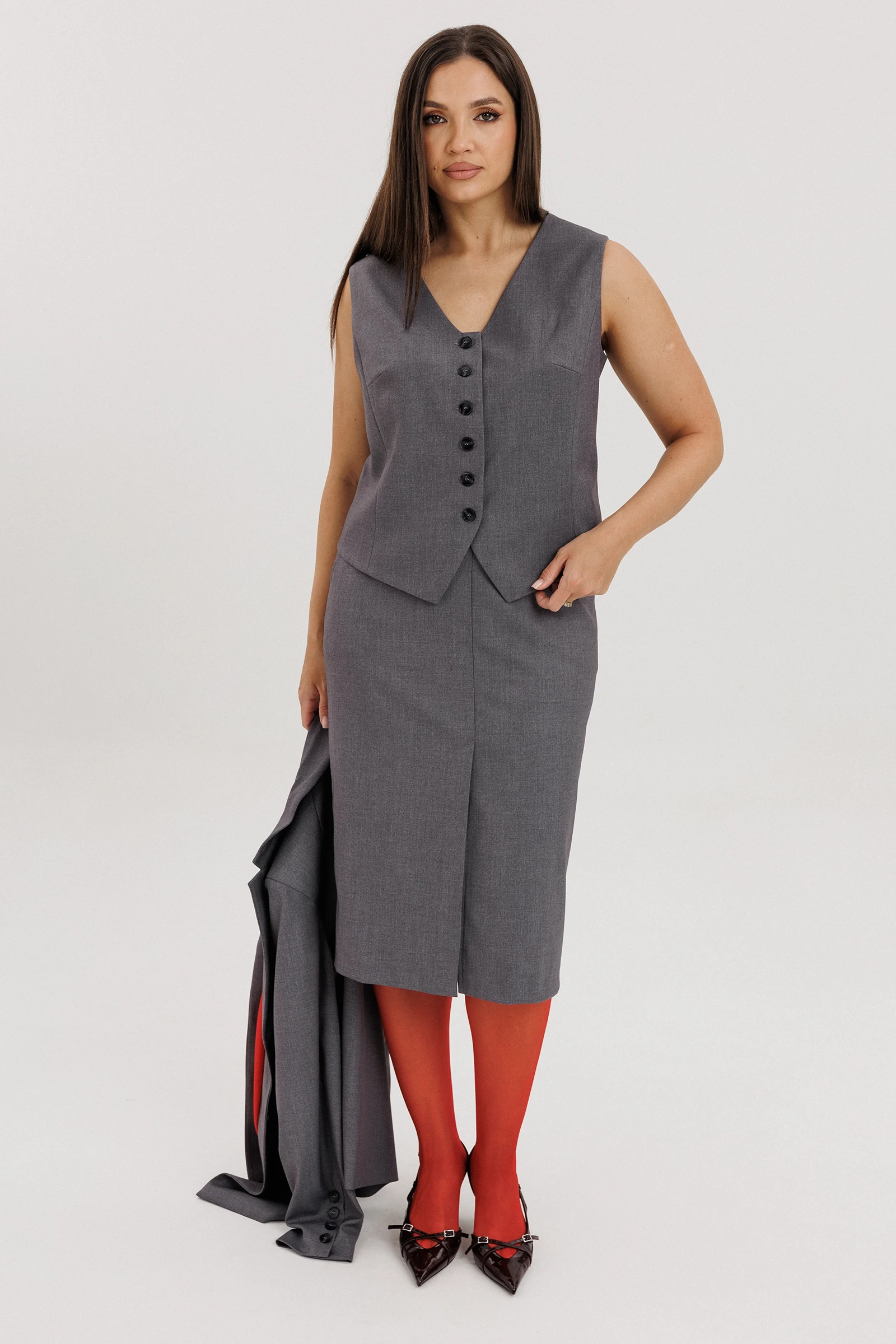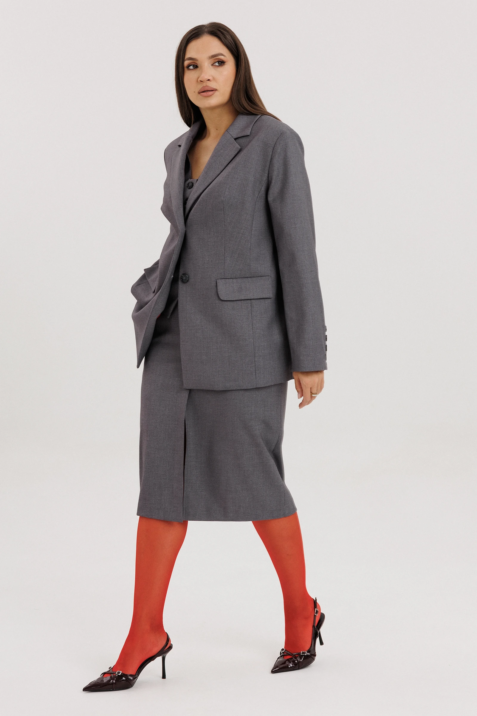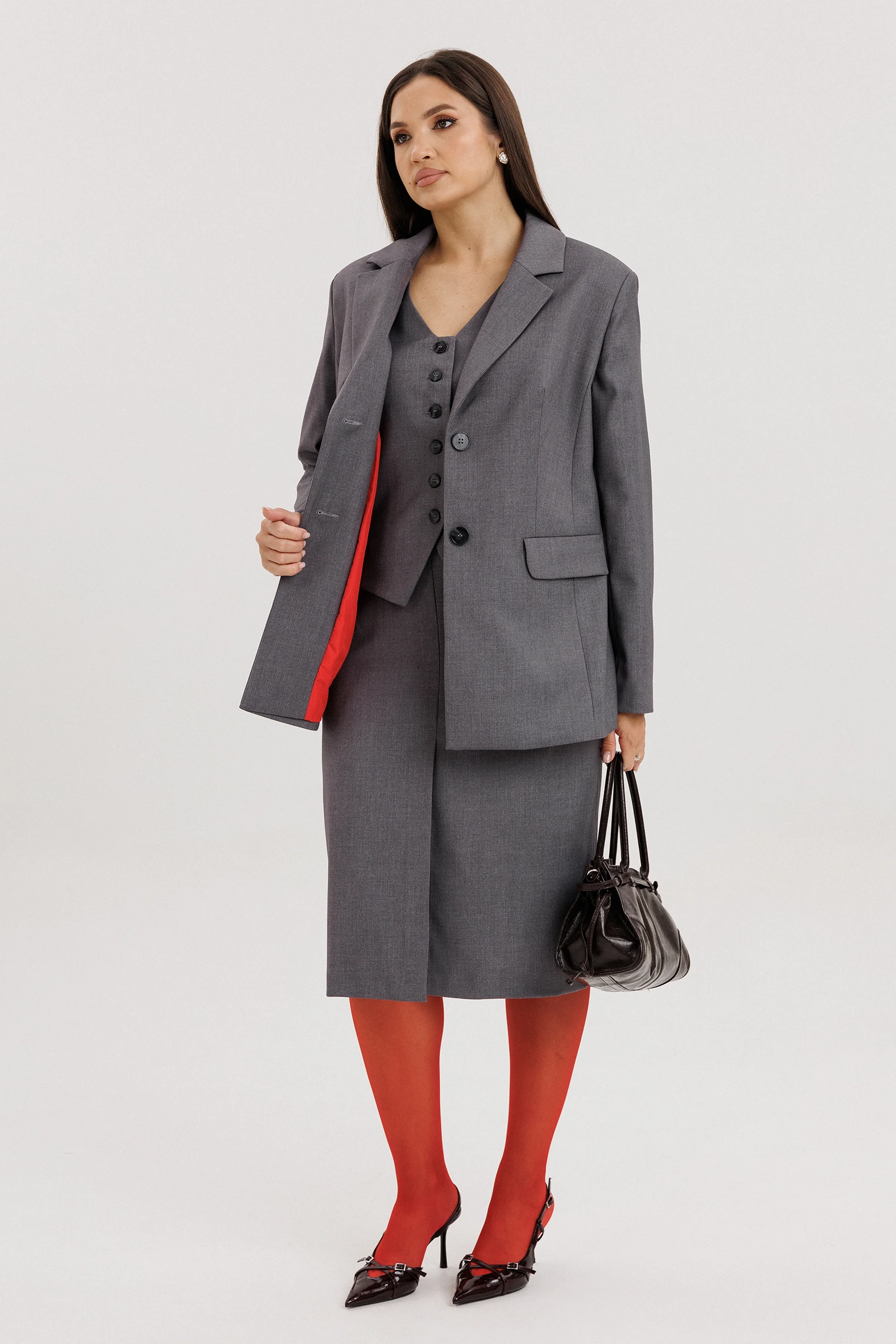 Жакет свободного расширенного силуэта, втачного покроя с центральной застёжкой и классическим английским воротником. Полочка с отрезным бочком, нагрудной вытачкой и прорезным карманом с клапаном. Спинка с центральным швом, высокой шлицей и отрезным бочком. Рукав двухшовный с отлетной шлицей и отделочными пуговицами.Жилет классический, полуприлегающего силуэта с центральной застёжкой, фигурным бортом и -образным вырезом. Полочка с отрезным бочком и нагрудной вытачкой. Спинка с центральным швом, отрезным бочком, талиевой и плечевой вытачкой. Юбка классическая длиной миди с притачным поясом, эластичным в области спинки, центральным швом и разрезом по переднему полотнищу.Длина жакета около 76 см. Длина рукава около 62 см. Длина жилета около 50 см. Длина юбки около 74 см.