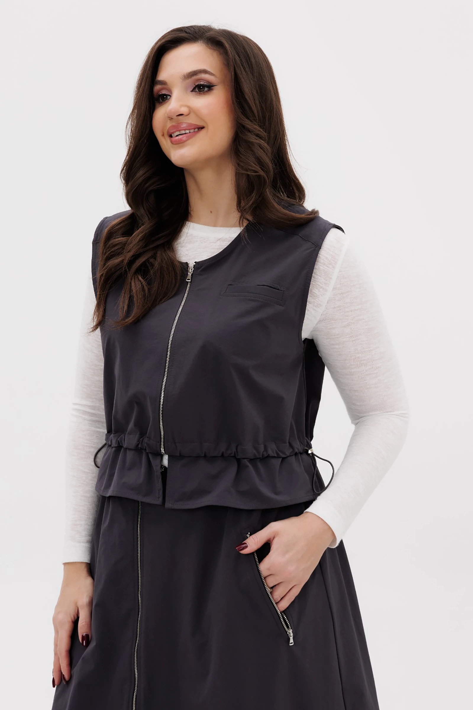 Жилет свободный с центральной застёжкой на тесьму-молнию, кулисой чуть ниже линии талии, неширокой баской. Полочки с отрезной кокеткой и прорезным карманом с листочкой. Кулиса с эластичным шнуром и фиксаторами. Юбка коническая, на притачном эластичном поясе с дополнительным шнуром-резинкой и фиксатором. По переднему полотнищу - застёжка-молния и боковые карманы с отделочными молниями.