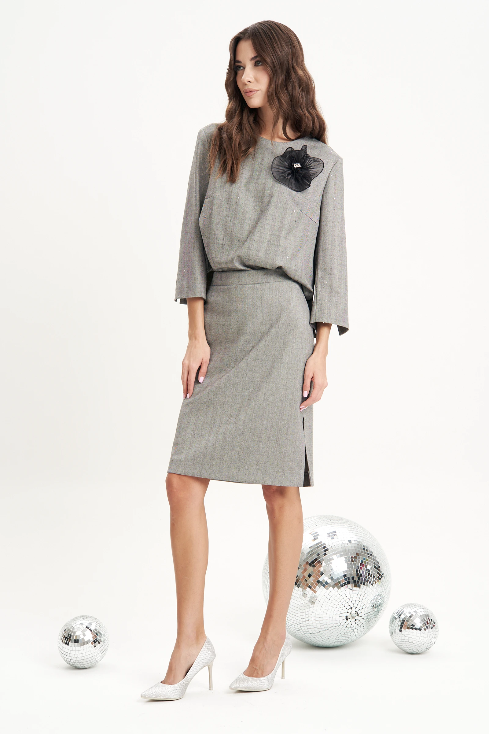 Юбка прямая, с эффектным разрезом, на притачном поясе, эластичном в области спинки. По заднему полотнищу - талиевые вытачки. Застёжка на потайную молнию по боковому шву.