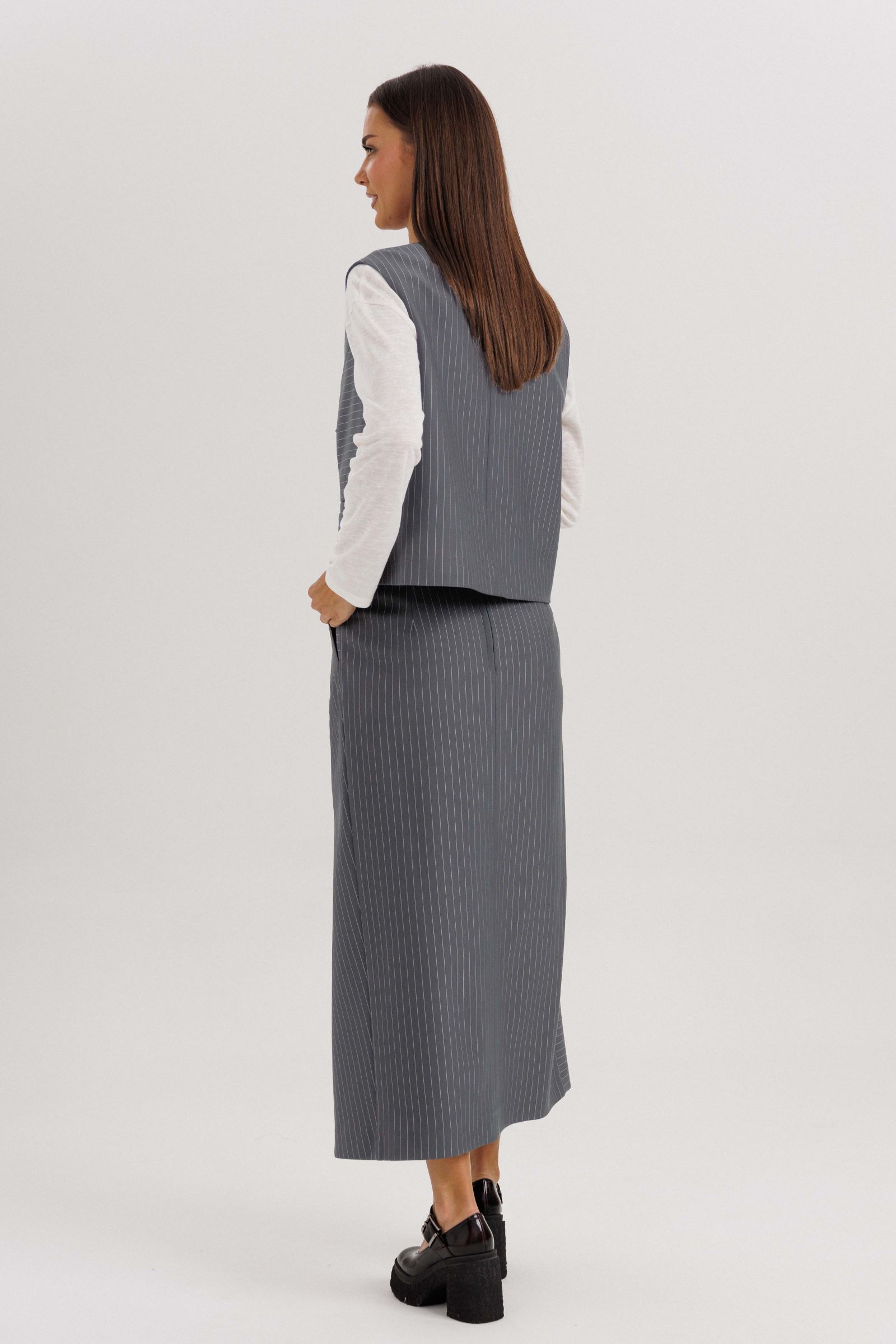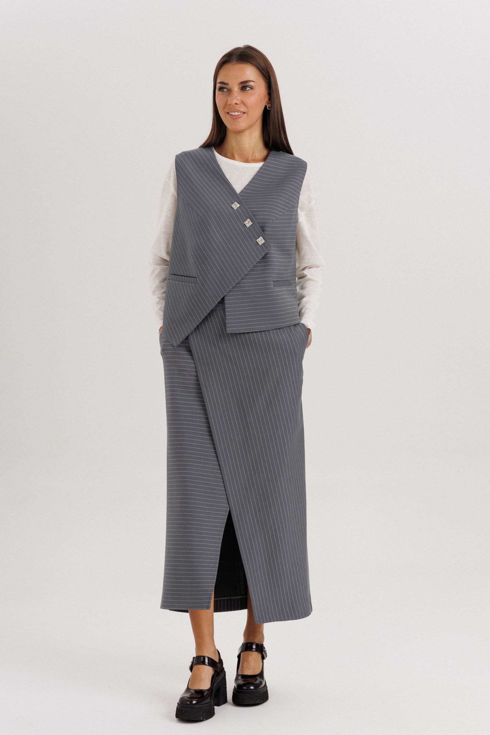Модель выполнена из плотной костюмной ткани с тонкой вертикальной полоской, которая визуально вытягивает силуэт и подчёркивает стройность. Жилет без рукавов застёгивается на декоративные пуговицы, создавая выразительный акцент в образе. Юбка миди с запахом добавляет женственности и комфорта при движении.