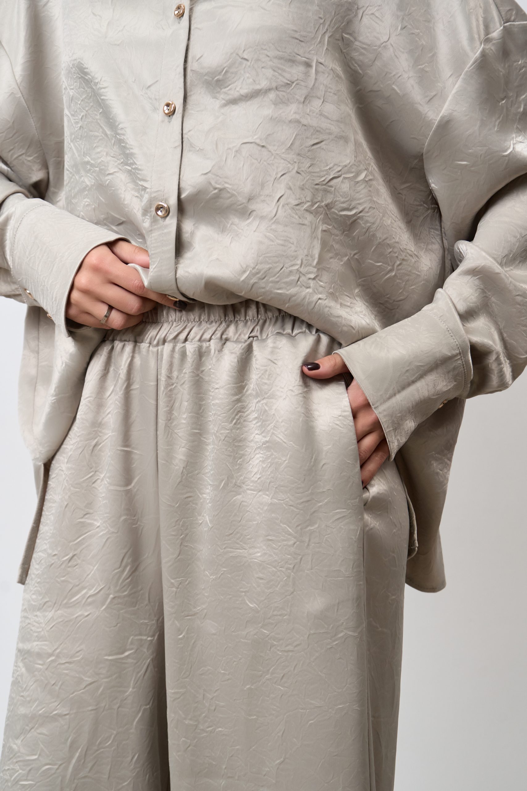 Мягкий блеск ткани добавляет образу утончённости, а «мятая» фактура — характер и динамику.