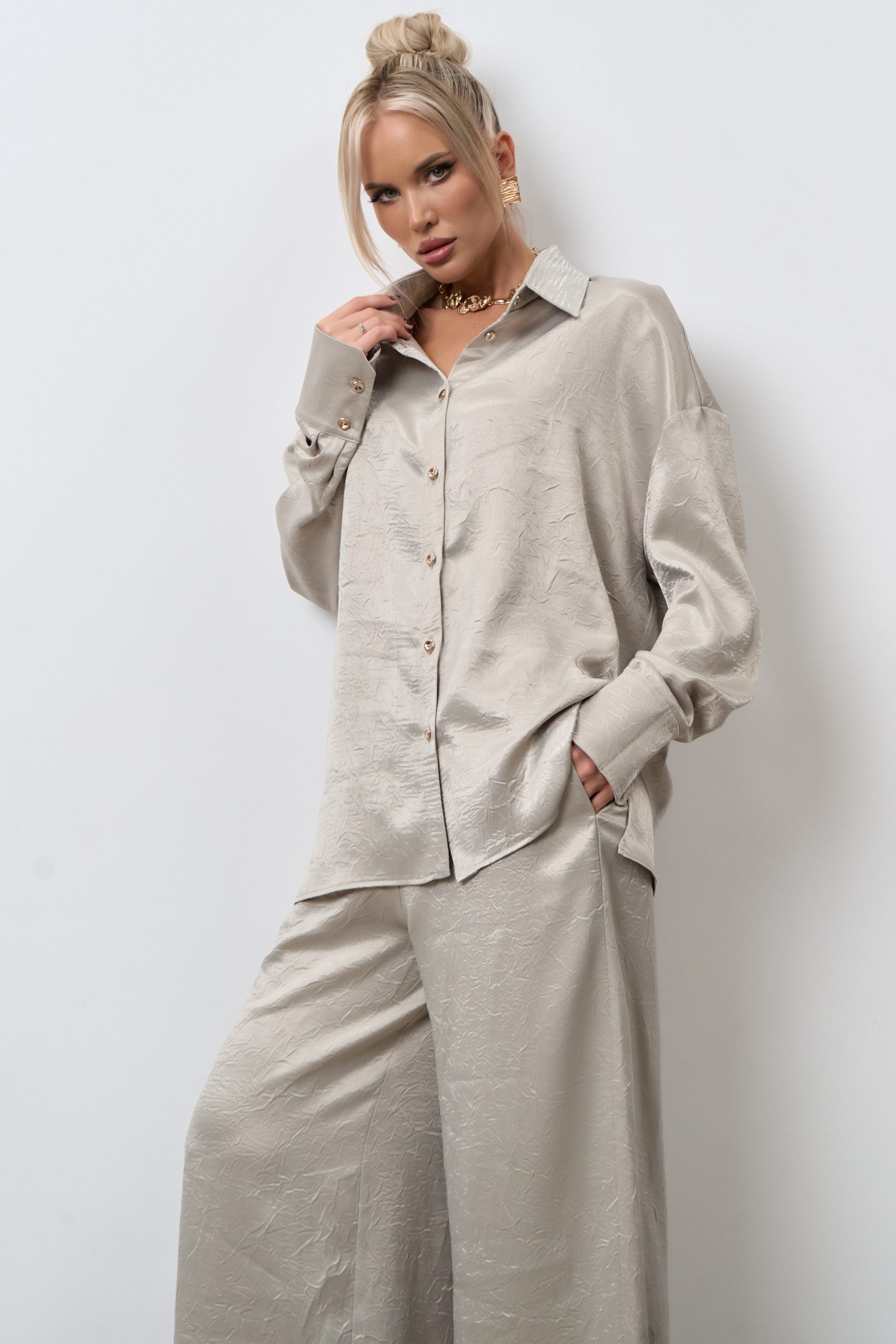 Рубашка свободного кроя и широкие брюки создают ощущение лёгкости и комфорта, при этом силуэт остаётся элегантным.