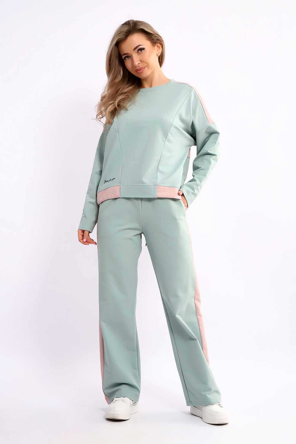 Костюм женский из мягкого, тонкого комбинированного футера . Свитшот с рельефами, в свободном стиле Oversize. Круглая горловина обработана обтачкой, спущенная пройма, длинный рукав, с надписью на передней полочке. На спинке кокетка, низ на широком манжете с декоративным шнуром. Брюки- трубы с лампасами и удобными карманами в боковых швах. Стильный, комфортный костюм идеальный вариант для повседневного гардероба.