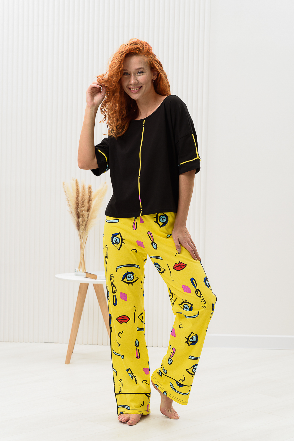 Костюм состоит из туники и брюк. Туника с округлой горловиной, свободная. Рукав короткий, с манжетом. Горловина обработана бейкой из основного полотна. Брюки прямые, на поясе, с боковыми карманами, с отделочным лампасом вдоль боковых швов.