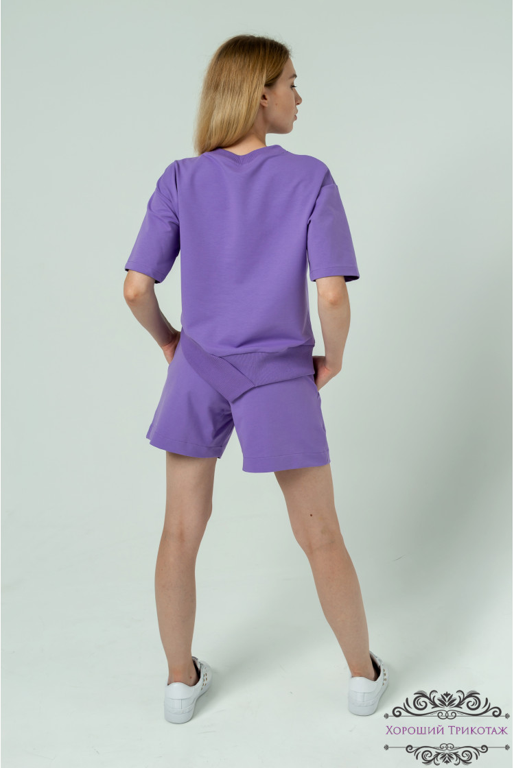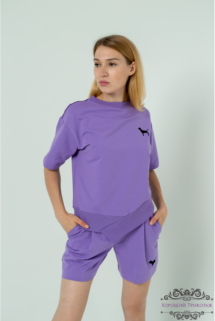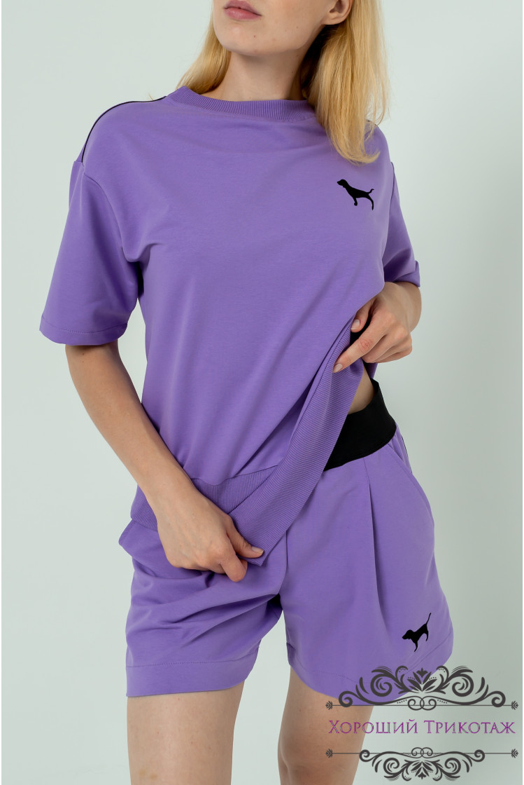 Стильный женский костюм с шортами. Выполнен из очень приятной и мягкой, но износостойкой и гипоаллергенной  (футер 2-х нитка). Асимметричная футболка с коротким втачным рукавом и принтом "Собака". Шорты с двумя карманами, пояс - широкая резинка.