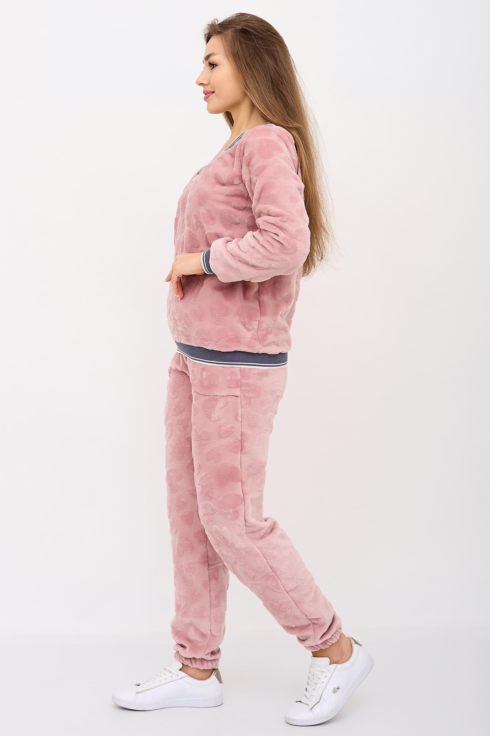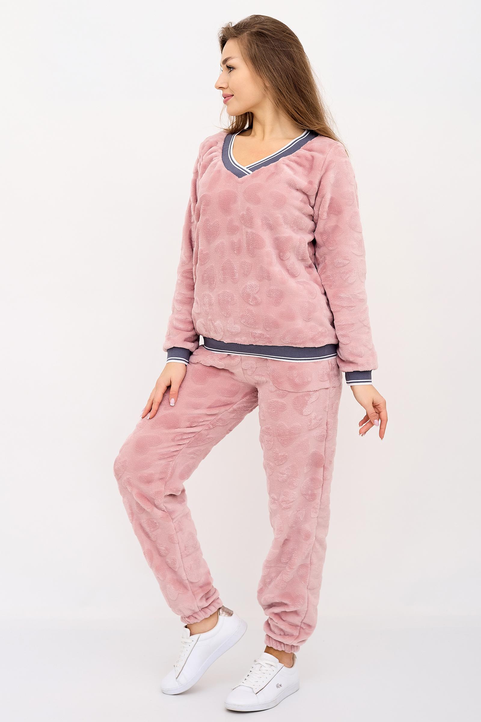 Мягкий и нежный женский теплый костюм Ия. Состоит из уютного джемпера и брюк. Пушистые брючки на резинке с карманами по бокам и креплением резинками на ногах. Сердечки на ткани придают шарм и женственность модели. Джемпер украшают широкие резинки в манжетах, воротнике и на поясе. Костюм уютный и теплый, в нем комфортно дома, на отдыхе, в отпуске.