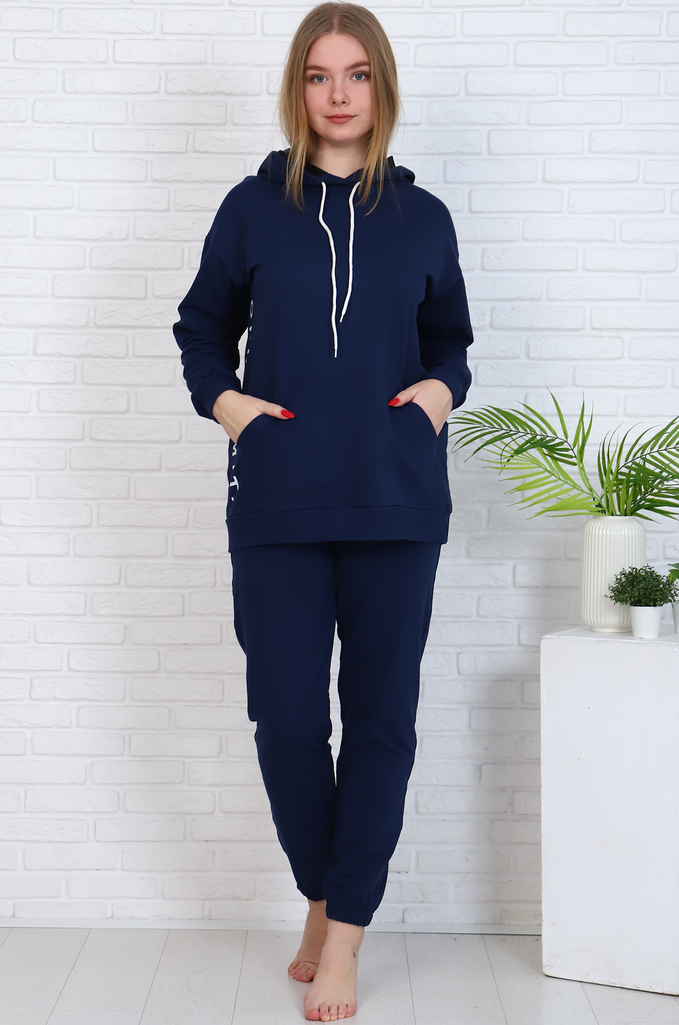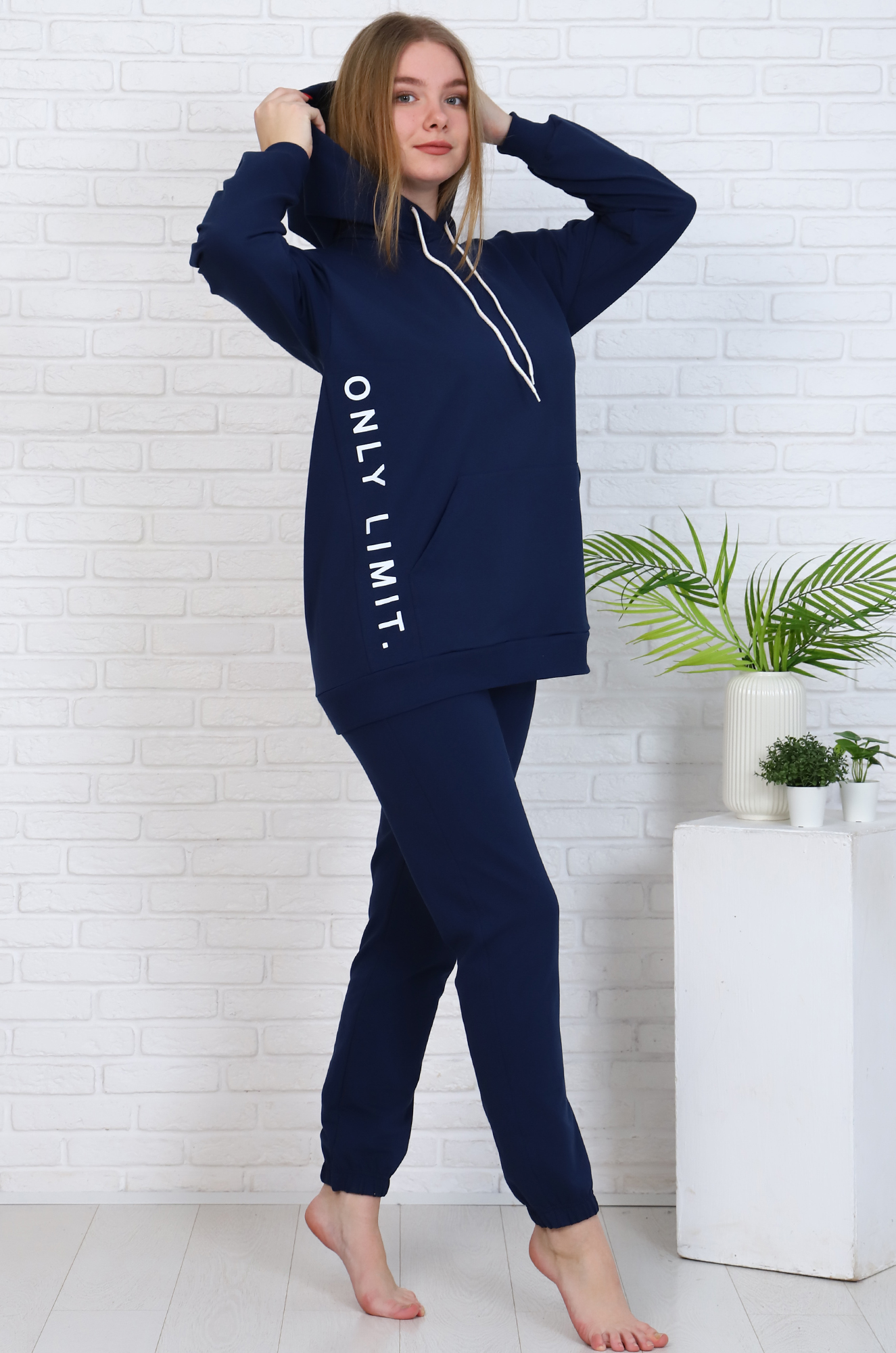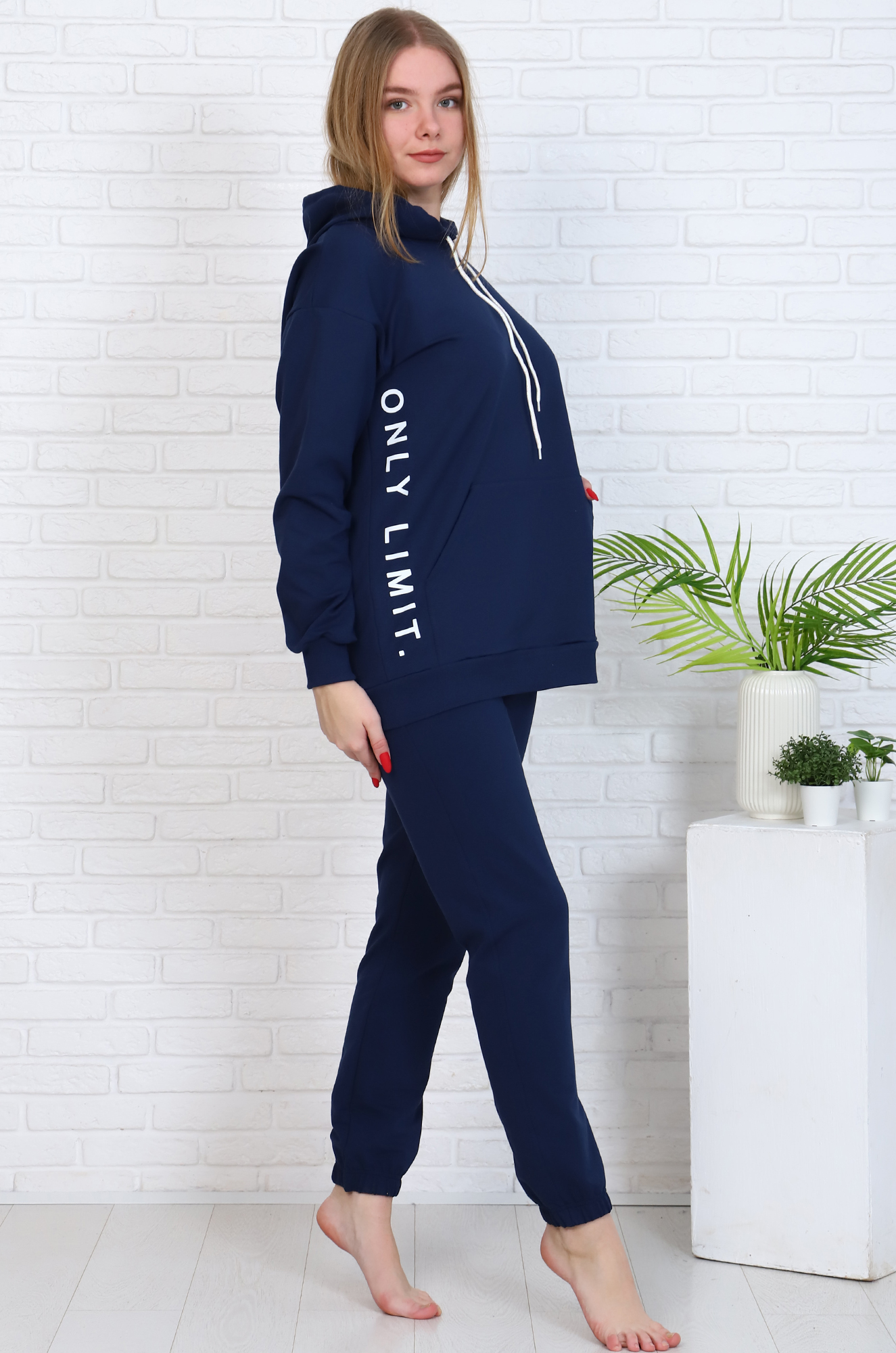 Удобный симпатичный костюм в спортивном стиле - отличный вариант для прогулок. Толстовка с капюшоном и карманом "кенгуру", неброский печатный принт на полочке. Брюки снизу на широкой резинке, по бокам карманы, пояс эластичный.