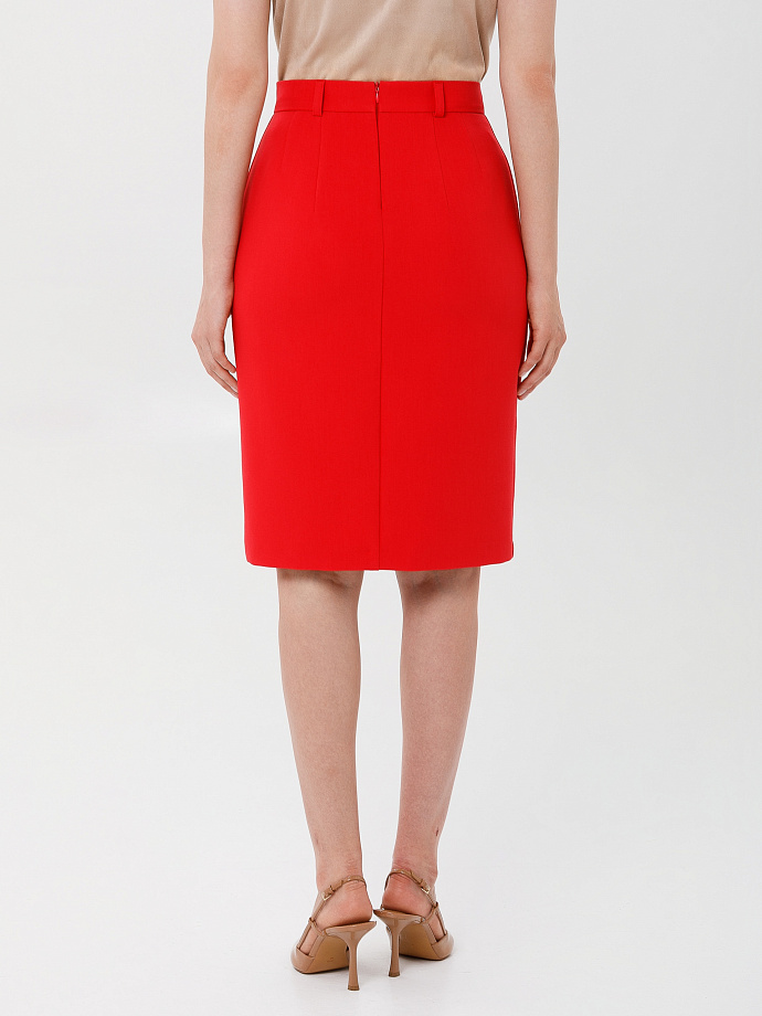 Модель прямого силуэта, слегка зауженная к низу, на подкладе. Перед ассиметричный, рельеф слева заканчивается высоким разрезом. Сзади в среднем шве обработана потайная застёжка молния. Пояс притачной, со шлёвками. Ремень в комплект не входит.
