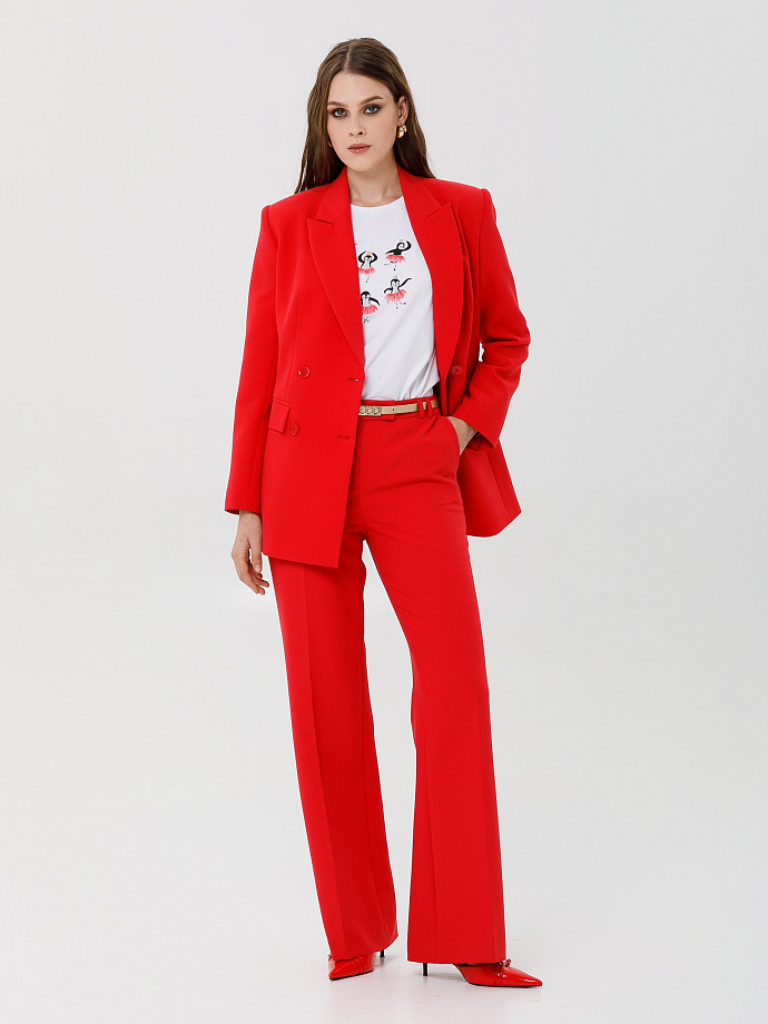 Модель с двубортной застёжкой на петли и пуговицы, на подкладе. Перед с рельефами и прорезными карманами в рамку с клапаном.  Спинка с рельефами и средним швом. Воротник пиджачный. По низу рукава обработана отлетная шлица с декоративными пуговицами и петлями.