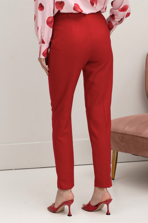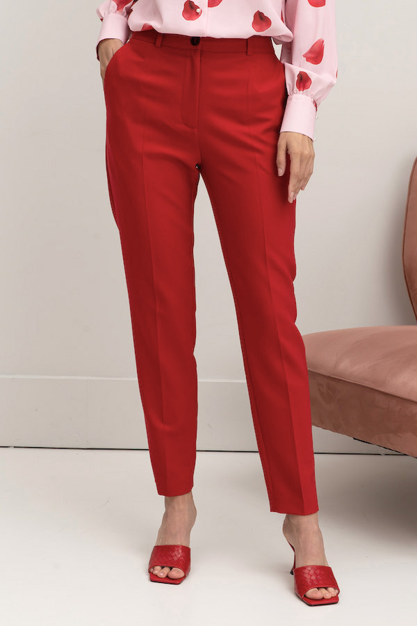 Брюки прямого силуэта, зауженные книзу из костюмной ткани. Застёжка на молнию-гульфик и пуговицу. Карманы с подкройным бочком. Притачной пояс со шлёвками.