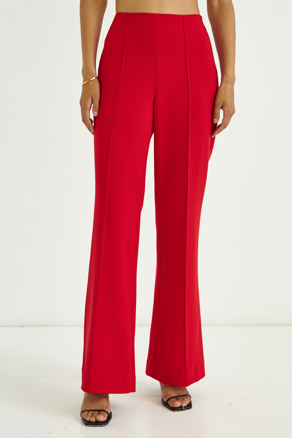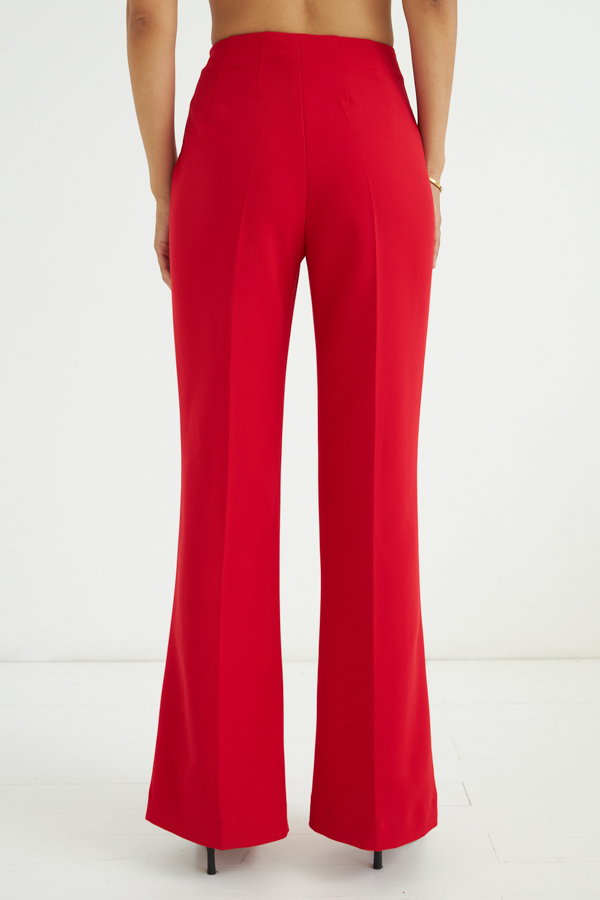 Брюки, зауженные в области колена и расклешённые книзу из костюмной ткани. На задней части брюк по талии выполнены две вытачки. На передней части застрочены стрелки. Брюки без пояса на обтачке. В боковом шве потайная молния. Низ брюк оформлен широкой подгибкой.