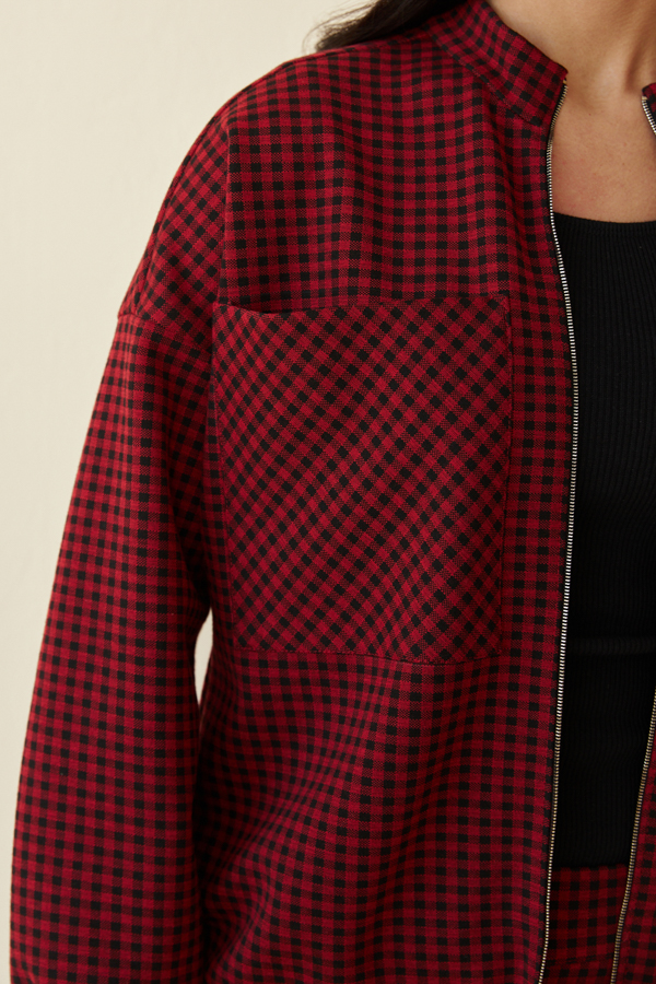 Жакет-бомбер выполнен из эластичного полотна с жаккардовым узором "клетка". Свободный силуэт с застёжкой-молнией и накладными карманами. Рукав втачной в спущенную пройму. Нижняя часть рукава и низ изделия присборены на резинку. Линия горловины оформлена воротником-стойкой.