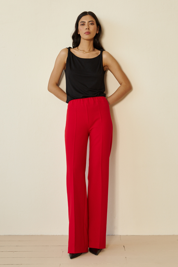 Брюки прямого силуэта из костюмной ткани. Пояс притачной с эластичной резиной.