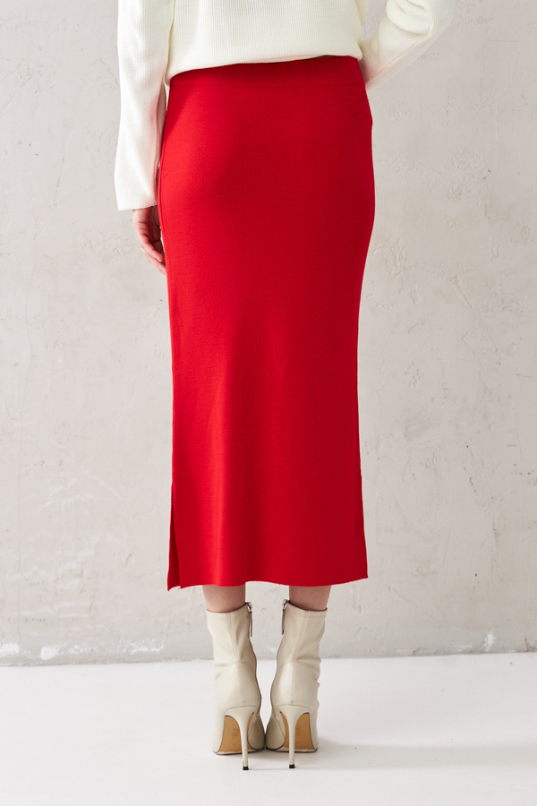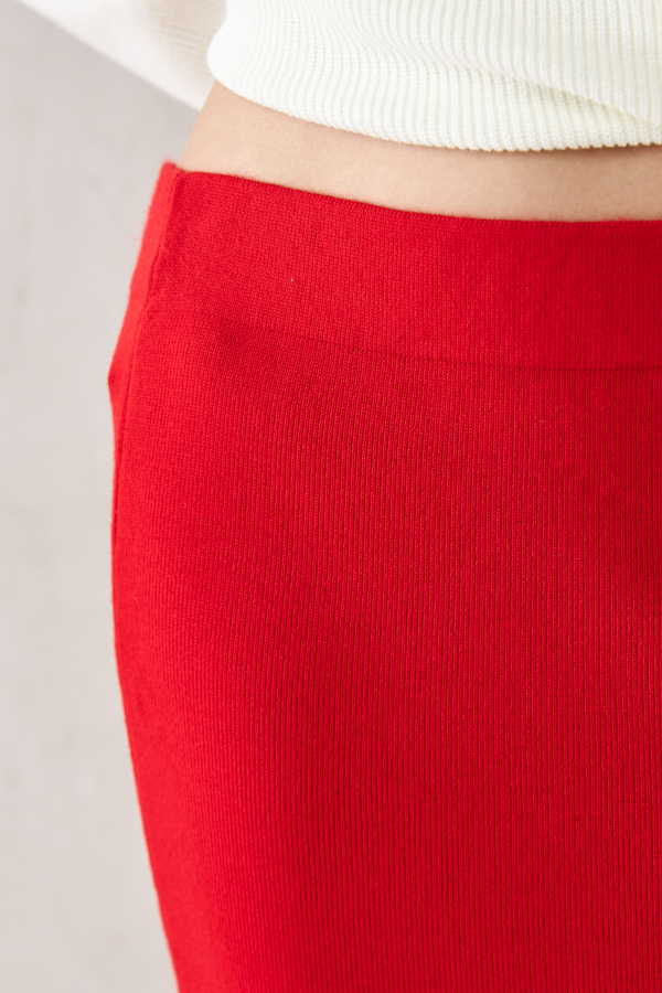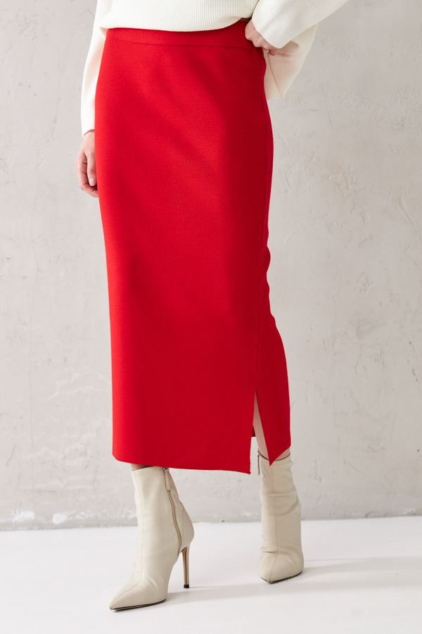 Юбка прилегающего силуэта с эластичным поясом и разрезом в боковом шве. Изделие выполнено из мягкой структурированной пряжи.