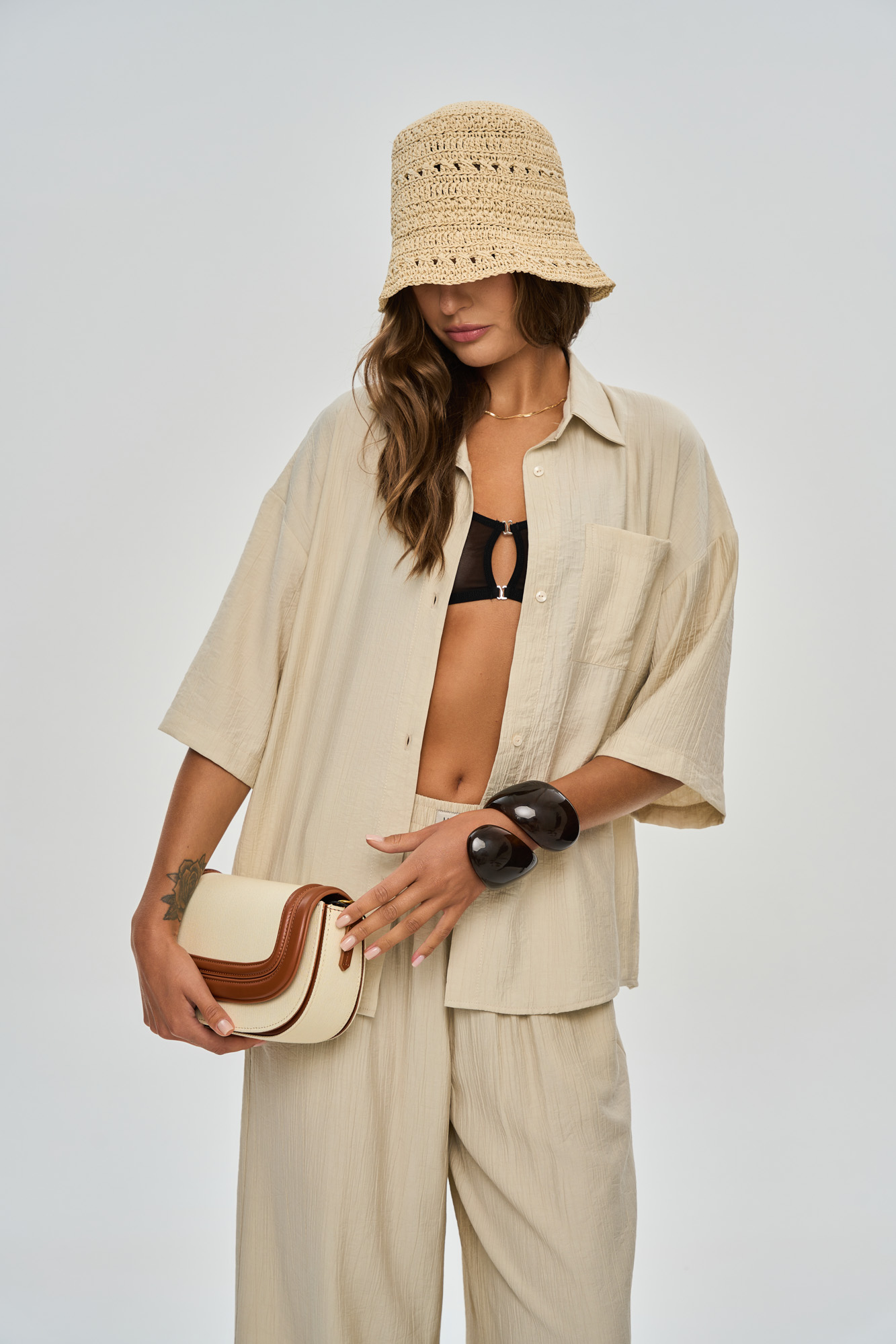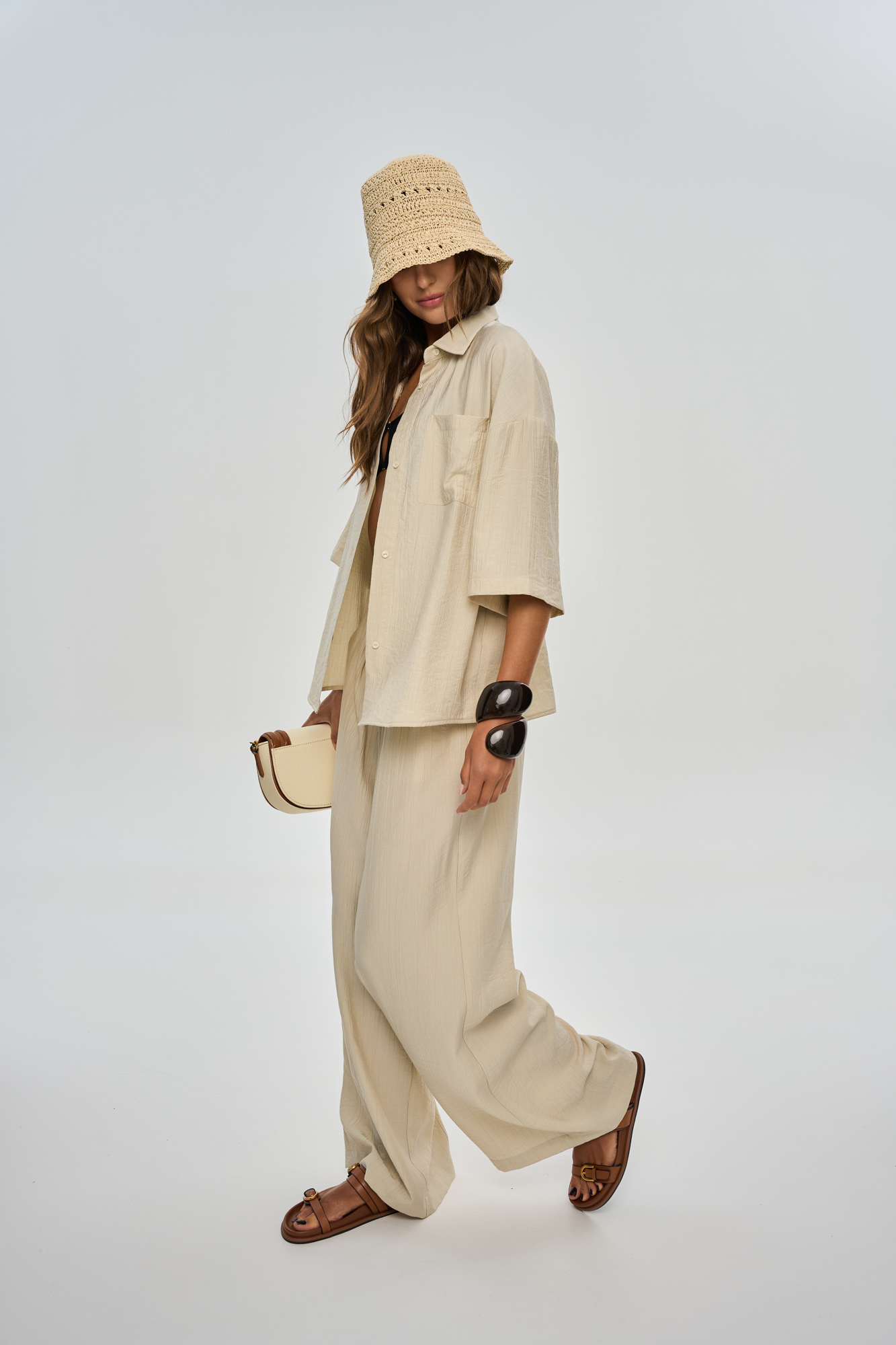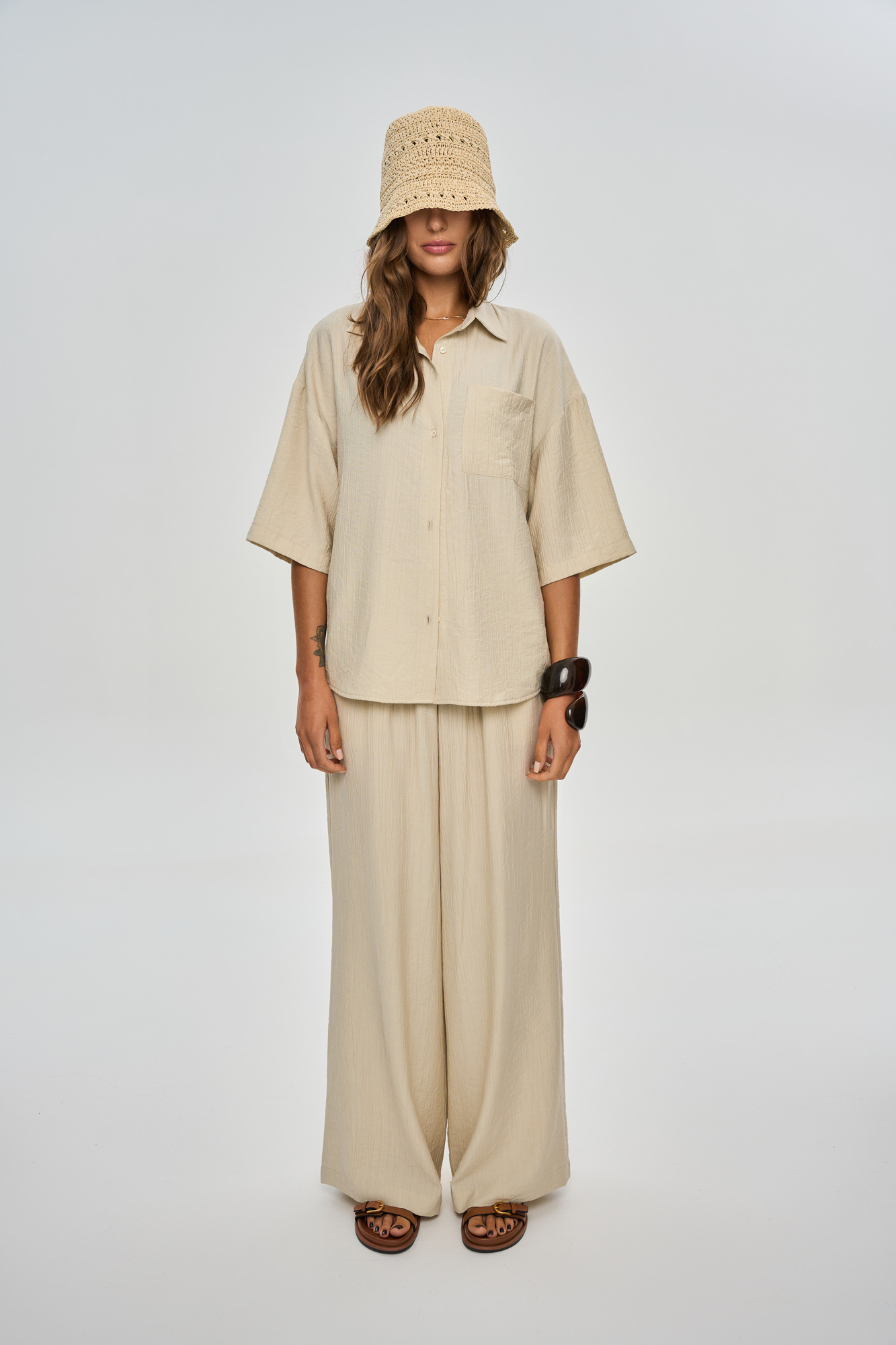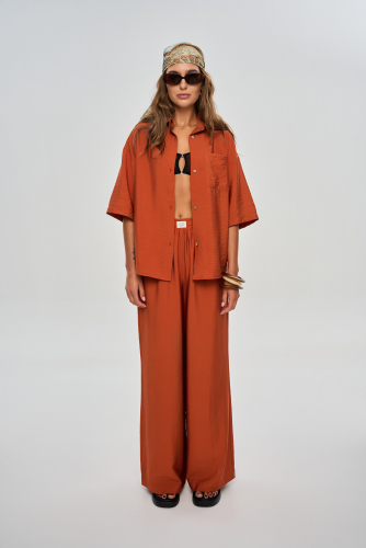Состоит из рубашки свободного кроя с застежкой на пуговицы и прямых широких брюк кроя "палаццо".