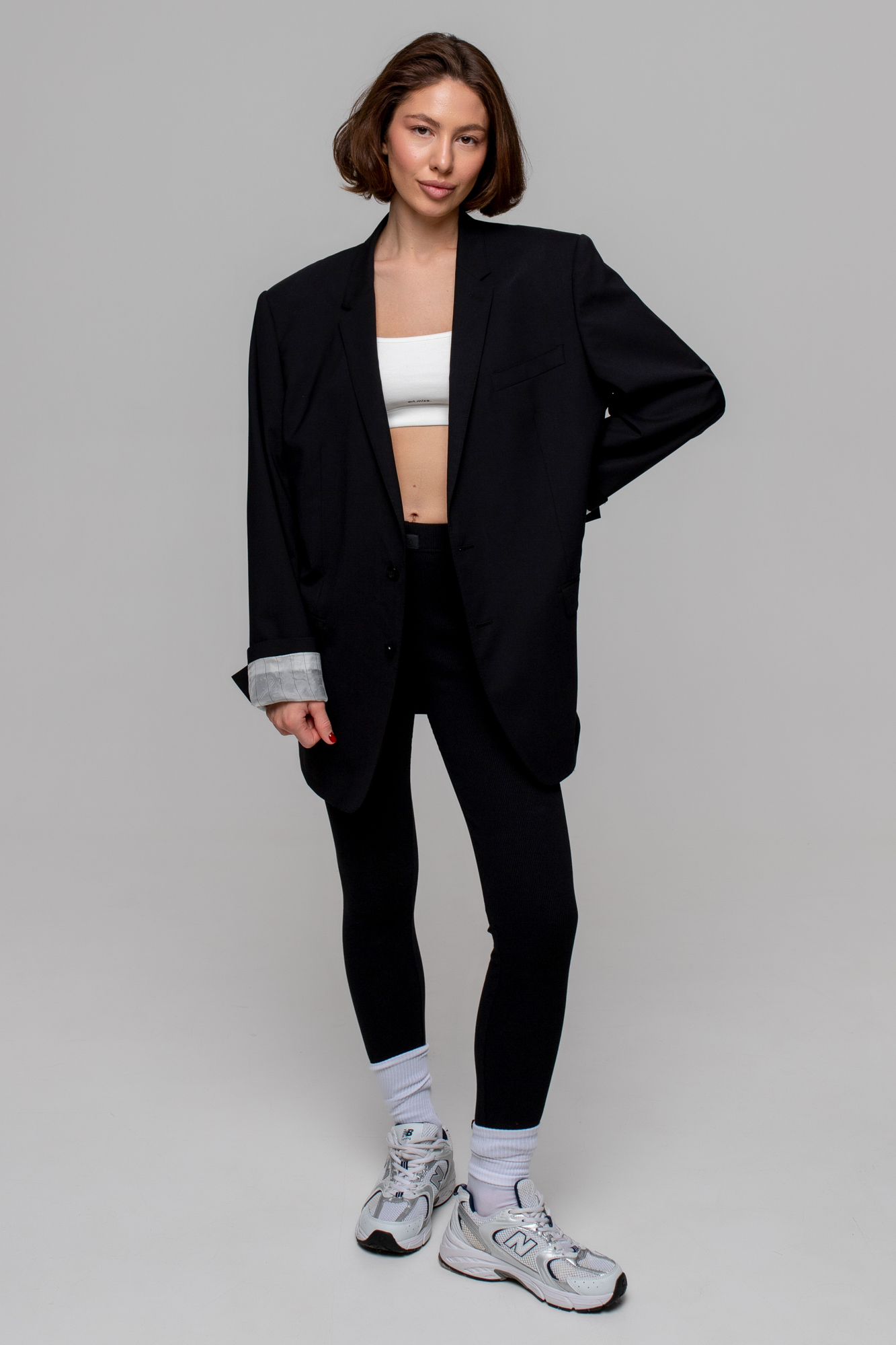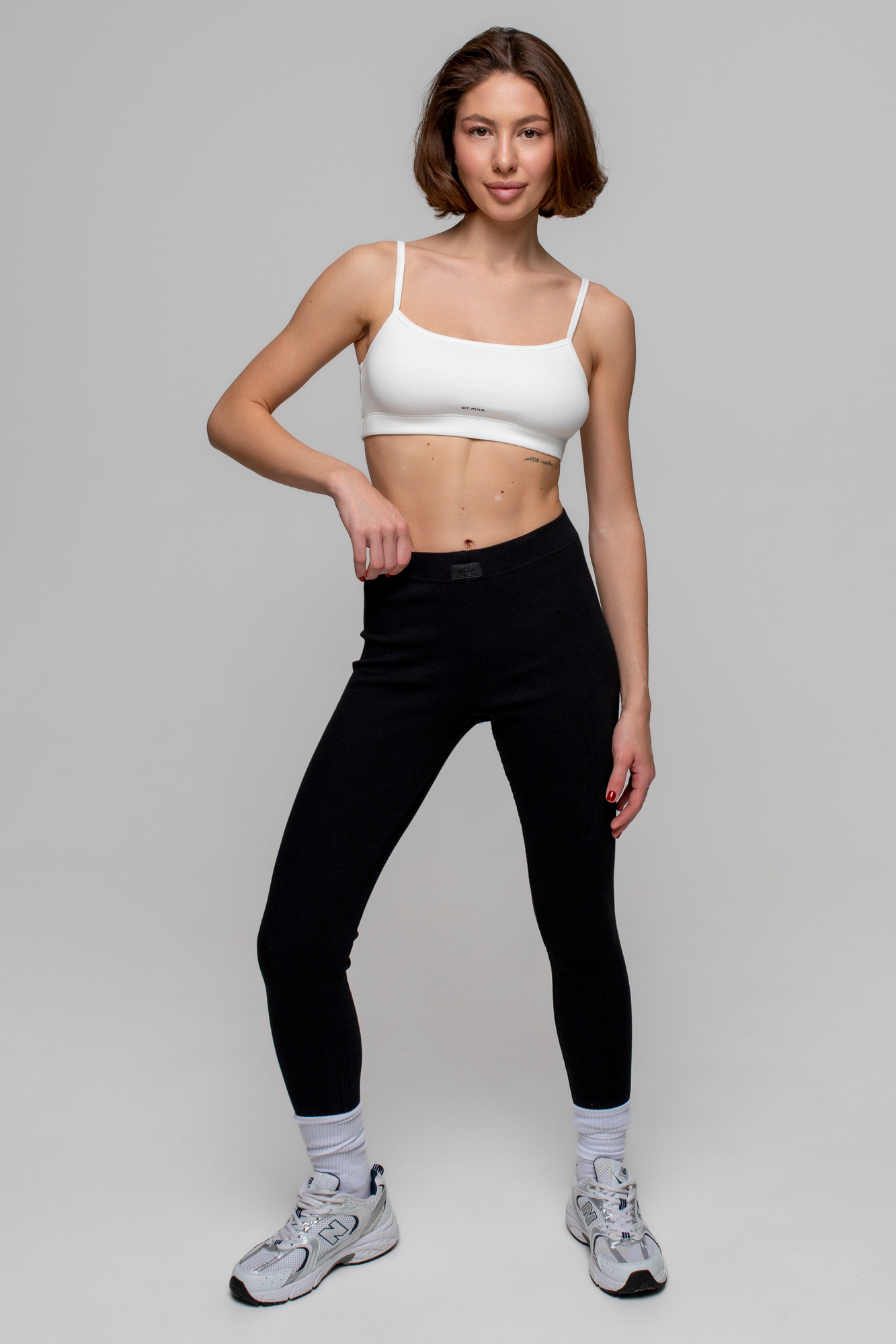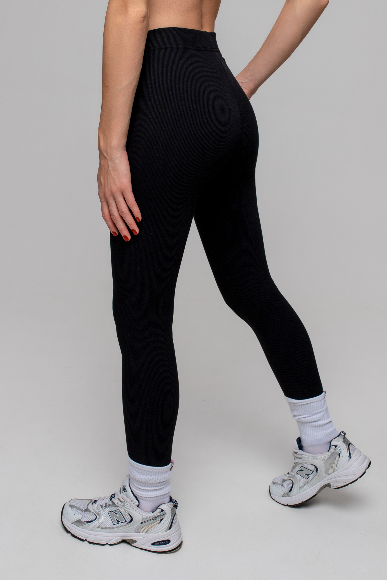 Легинсы базового кроя из плотного трикотажа в мелкий рубчик, пояс на эластичной резине, оформлен брендированной нашивкой.