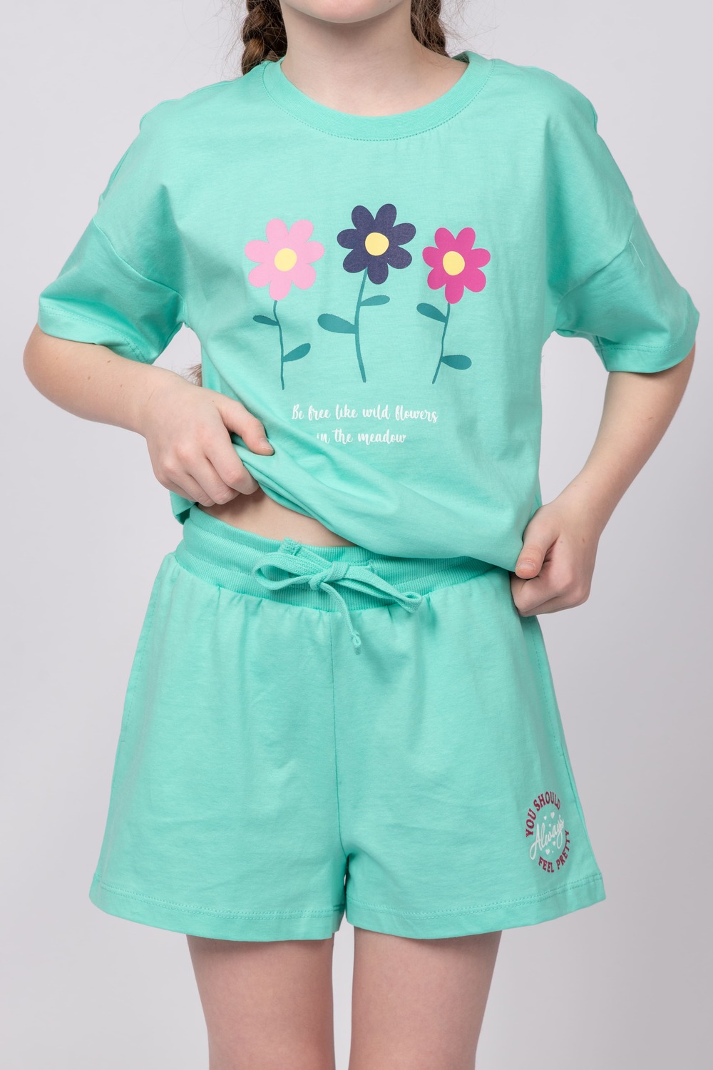 Модные и удобные трикотажные шортики - отличный выбор для девочек на летний сезон и для занятий спортом. По поясу шорт вставлен плоский утягивающий шнурок в цвет шорт, низ шнурка подвернут и застрочен. На левой передней половинке шорт принт шелкография с глиттером. Надпись переводится как Ты всегда должна чувствовать себя красивой. Эти шортики для девочек идеально подходят для повседневных летних прогулок.