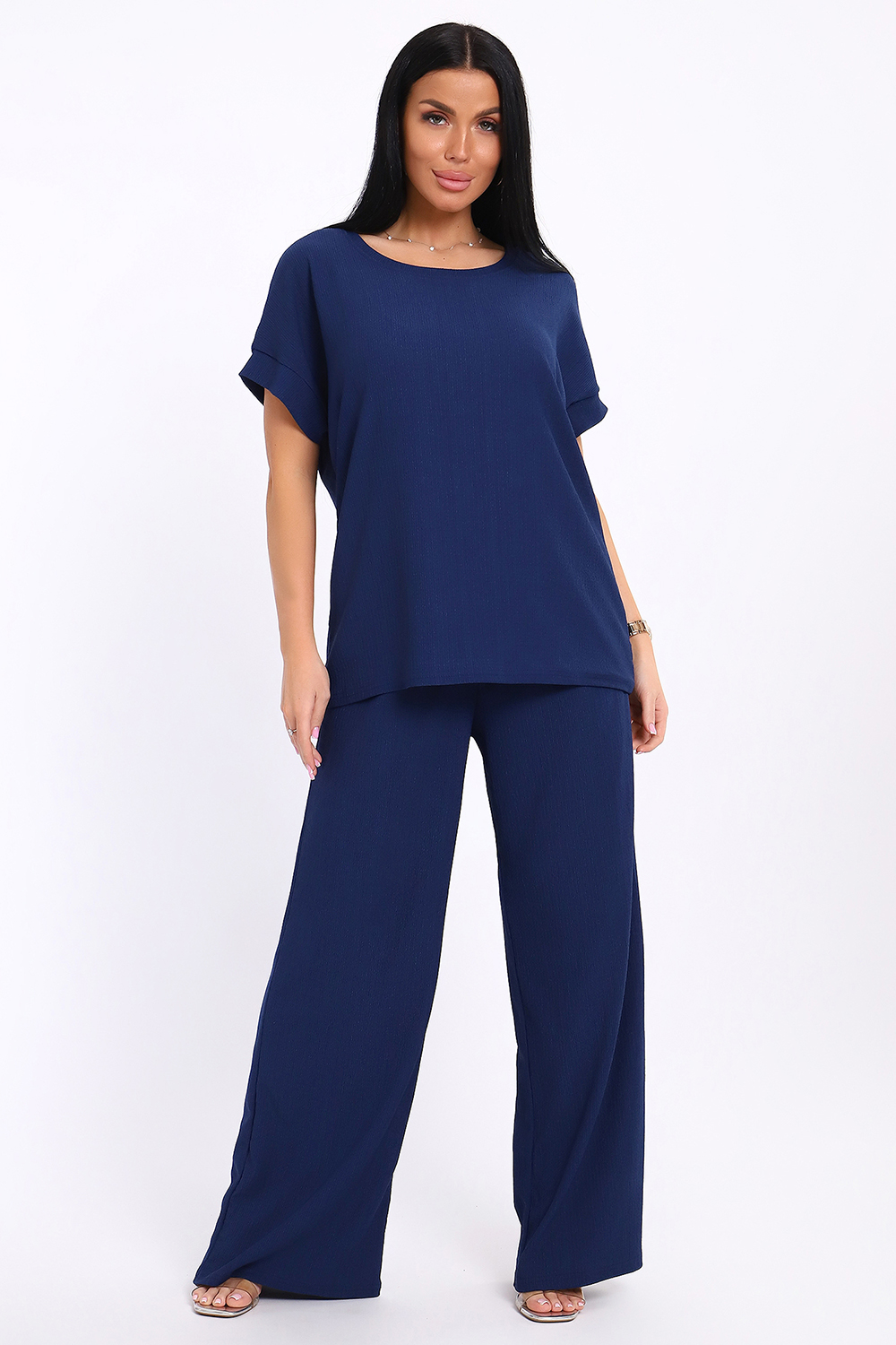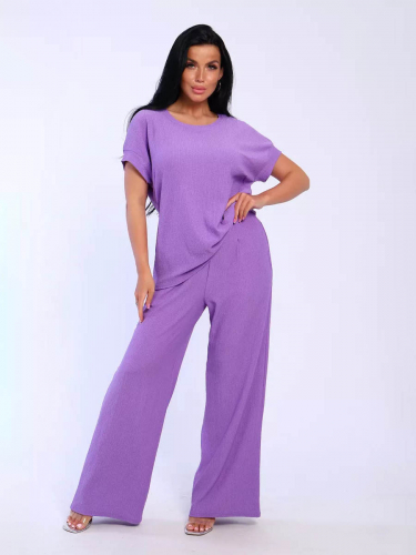 Брюки палаццо и футболка со спущенной проймой и с круглым вырезом горловины из тонкого, струящего материала - жатка. Такой красивый модный костюм не оставит равнодушной ни одну модницу. Вещи представлены стандартных и больших размеров для дам с пышными формами. Расклешенные брючки с завышенной талией на резинке с карманами отличаются удобным кроем, они стандартной длины и превосходно садятся по фигуре женщин, визуально удлиняют ноги и придают силуэту идеальные очертания. Благодаря наличию нагрудных вытачек футболка идеально садиться по фигуре.