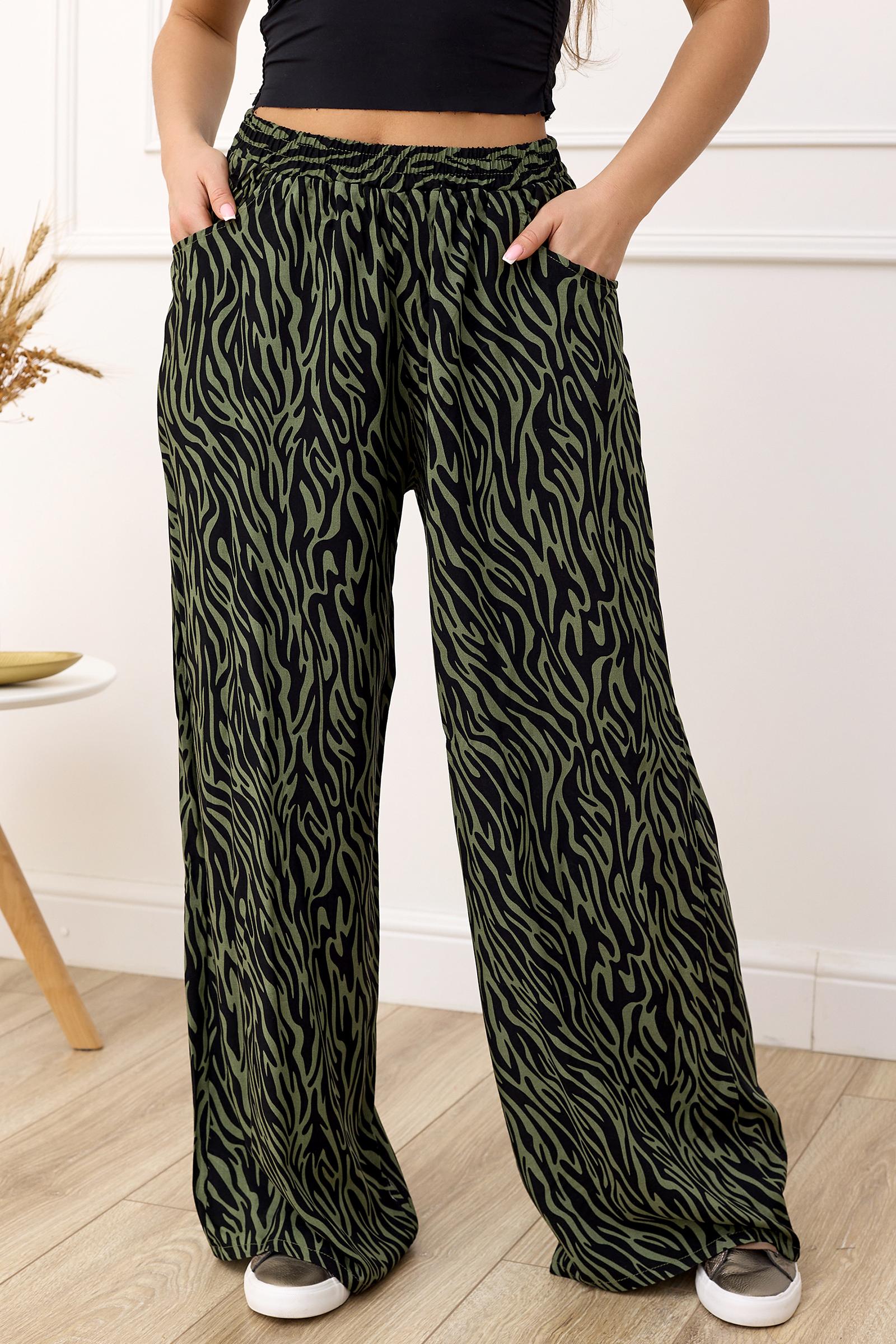 Широкие, легкие брюки Жара с расцветкой в стиле Сафари. Женские брюки отлично сочетаются с вещами базового гардероба. С ними легко создавать крутые, стильные образы на каждый день. Красиво брюки сочетаются с однотонным верхом и красивой летней обувью.