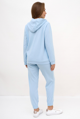 Модный фасон костюма Моника подарит Вам удобство и комфорт движений. Нежный голубой цвет находится сейчас на пике популярности и означает, что Вы в тренде модных новинок одежды. Свободный костюм визуально смотрится стильно и очень красиво. Капюшон и карманы на худи добавят больше удобства в носке. Штаны фиксируются резинками на талии и штанинах. Универсальная модель костюма позволит комбинировать вещи и с другой одеждой.