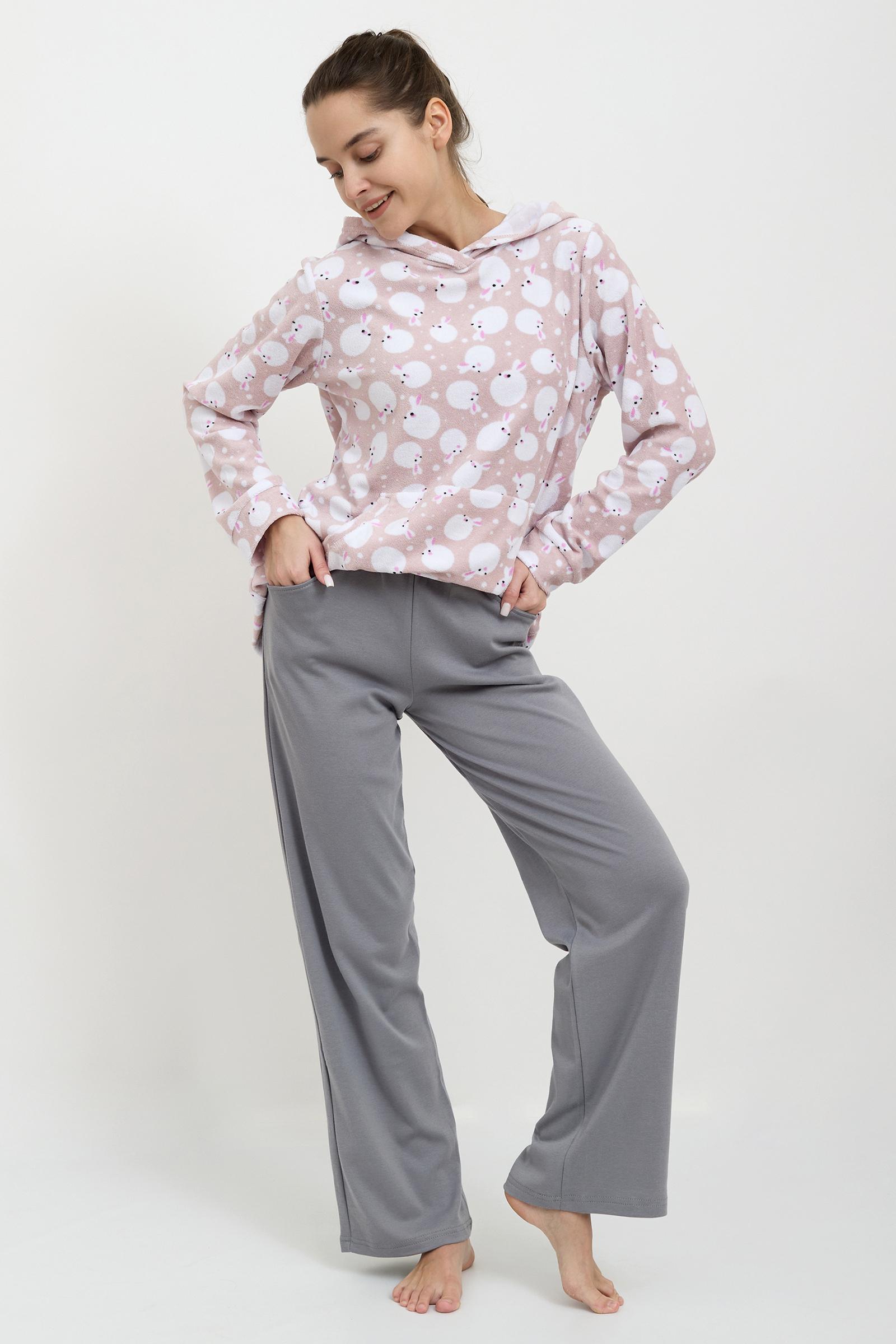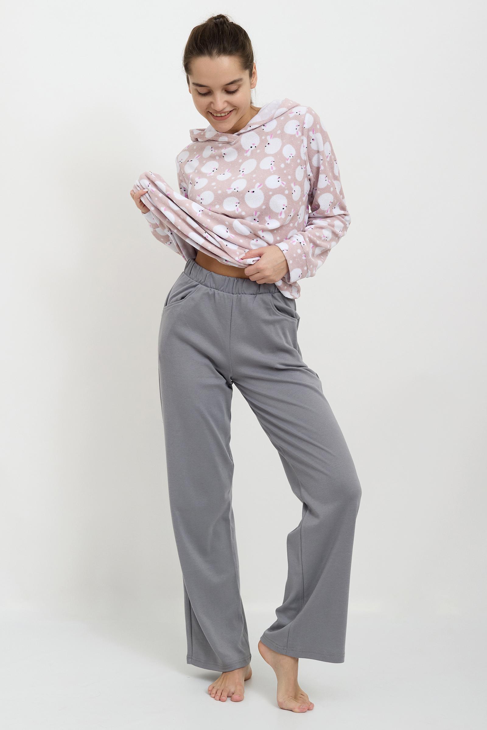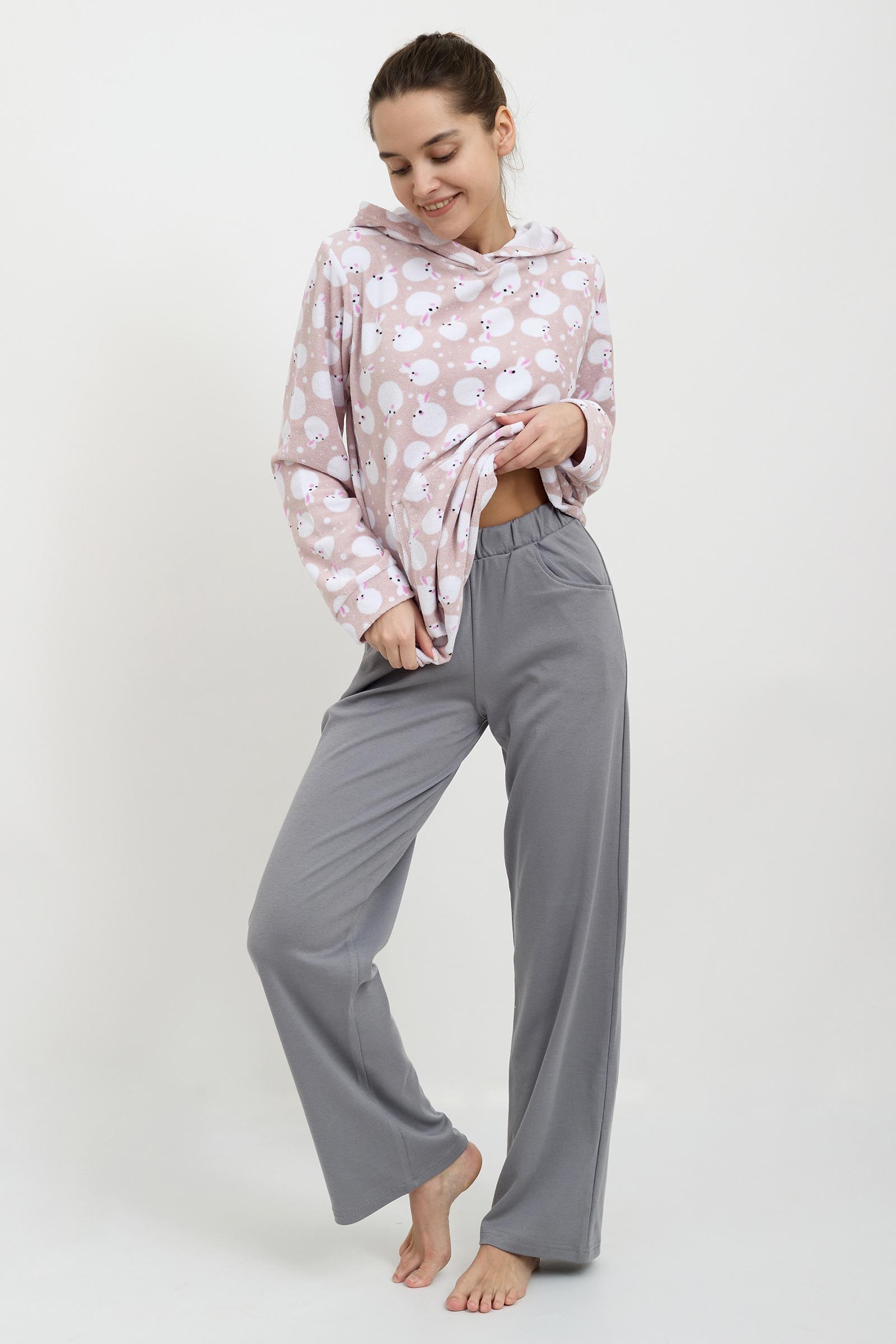 Женский костюм Зайка создан для романтичных и нежных женщин. Такой уютный и мягкий комплект удобно носить как дома, так и в гости, на прогулку, в отпуске. Состоит костюм из худи и брюк. Свободные брюки с поясом на резинке и кармашками для удобства. Спортивная удлиненная худи с капюшоном и длинными рукавами. Кармашки формы кенгуру добавляют комфорт в носке. Красивый принт в виде зайчиков делает образ воздушным и нежным.