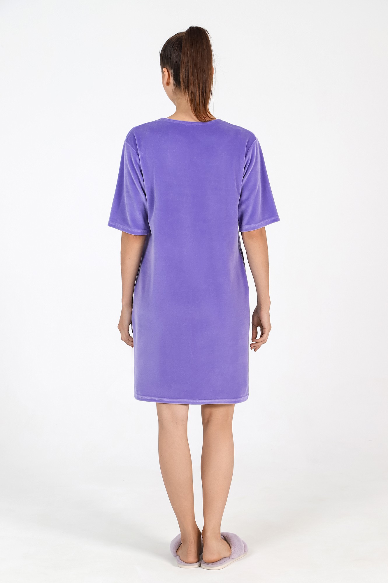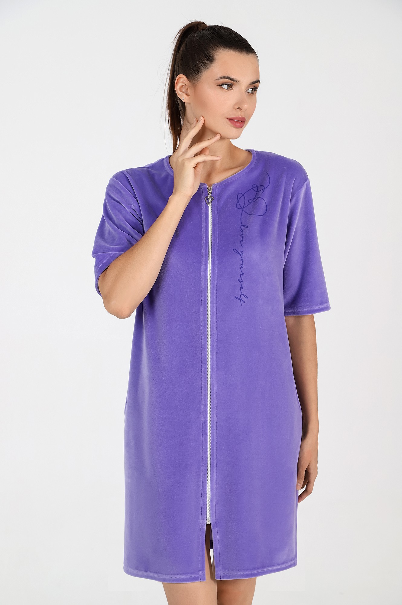Халат из гладкокрашеного полотна «велюр», прямого силуэта, с втачными рукавами длиной ¾, горловиной овальной формы, карманами в боковых швах и центральной бортовой застежкой на тесьму «молния». На полочке выполнена печать в технике «шелкографии».