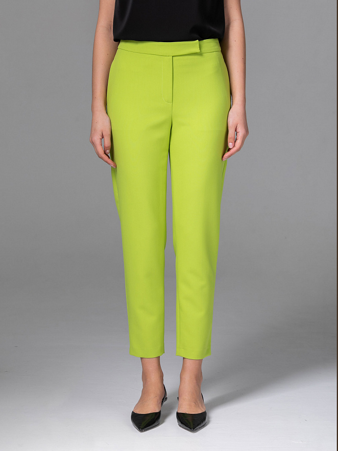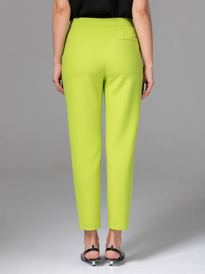 Застёжка на молнию и крючки на поясе. Пояс подкройной. В боковых швах карманы. Сзади имитация прорезного кармана с листочкой.