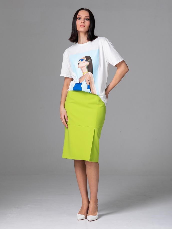 Пояс подкройной. Перед ассиметричный, с горизонтальным подрезом и шлицей в рельефе. Сзади в среднем шве потайная застёжка молния.