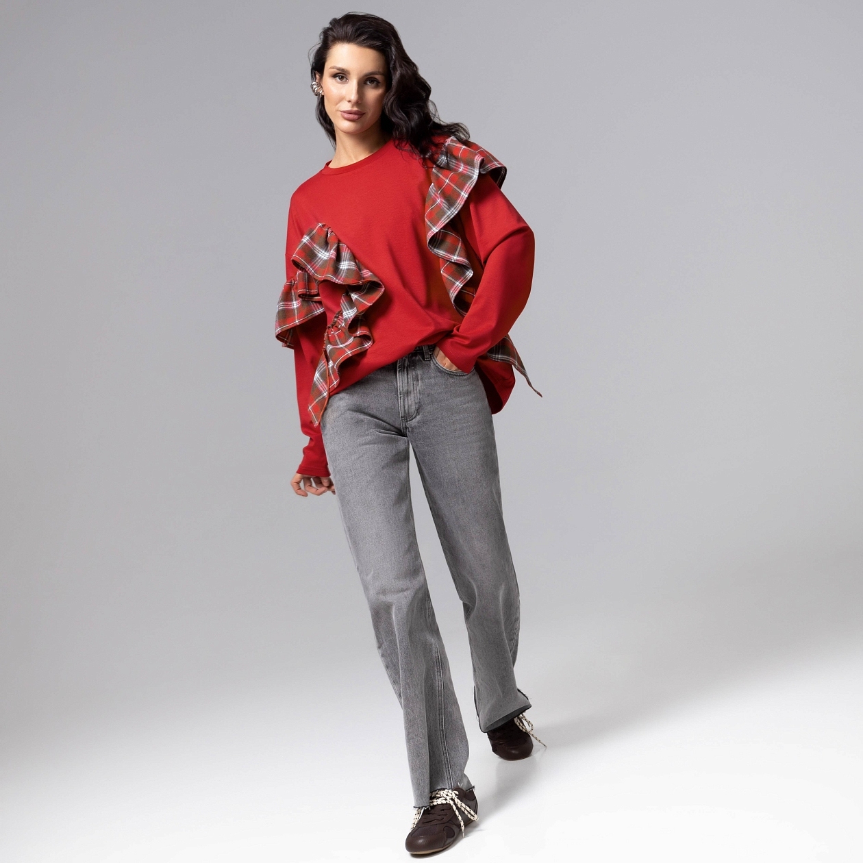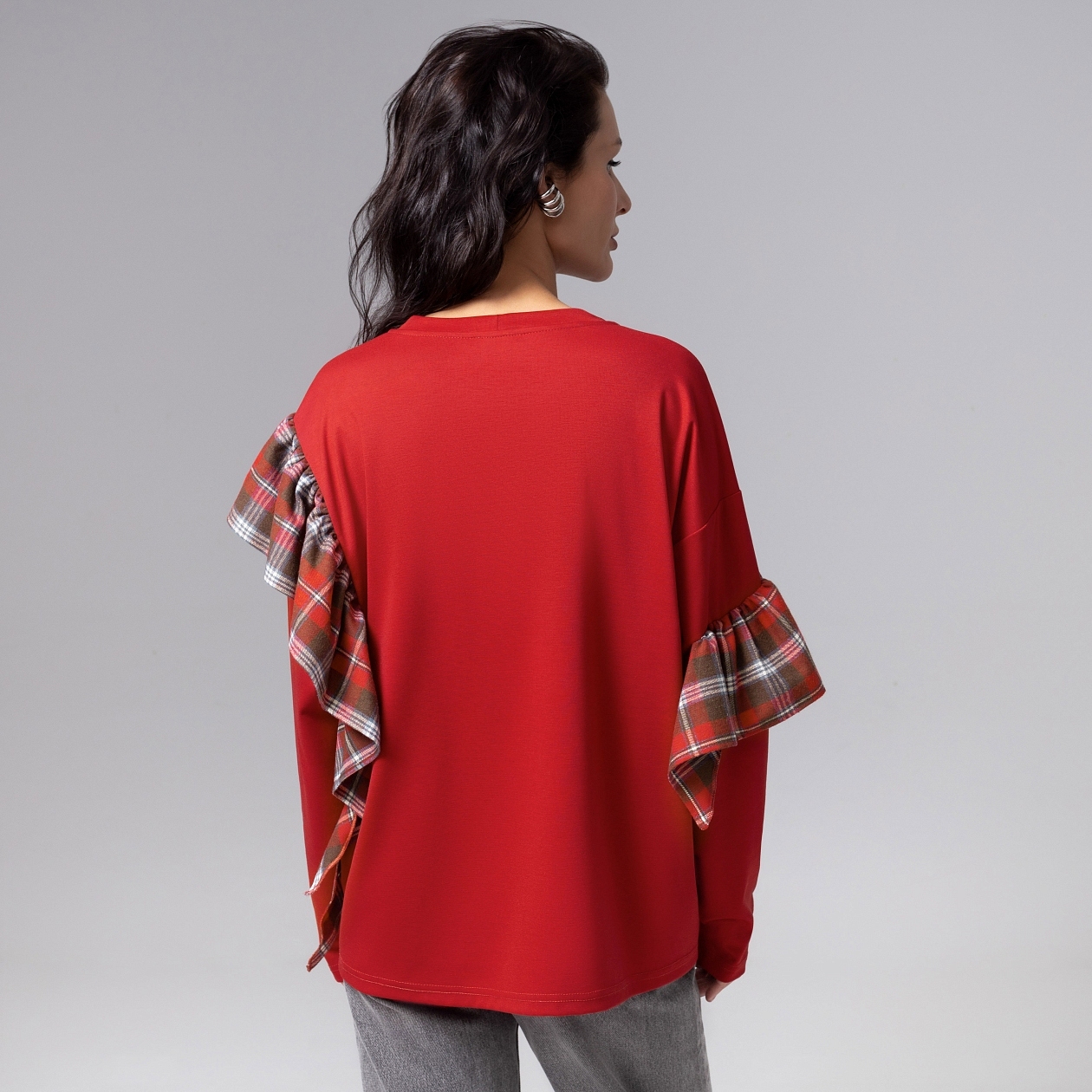 Лонгслив насыщенного красного цвета выполнен в одном из главных цветов сезона FW 25/26 по версии Pantone. Модель украшена элегантными объемными рюшами, которые создают выразительный акцент и подчеркивают женственный силуэт. Безупречный пошив демонстрирует идеально ровные строчки и тщательную обработку всех деталей. Свободный крой гарантирует комфортную посадку на любой тип фигур, а ткань – исключительную мягкость и долговечность. Лонгслив станет яркой премиальной базой для создания как повседневных, так и нарядных образов.